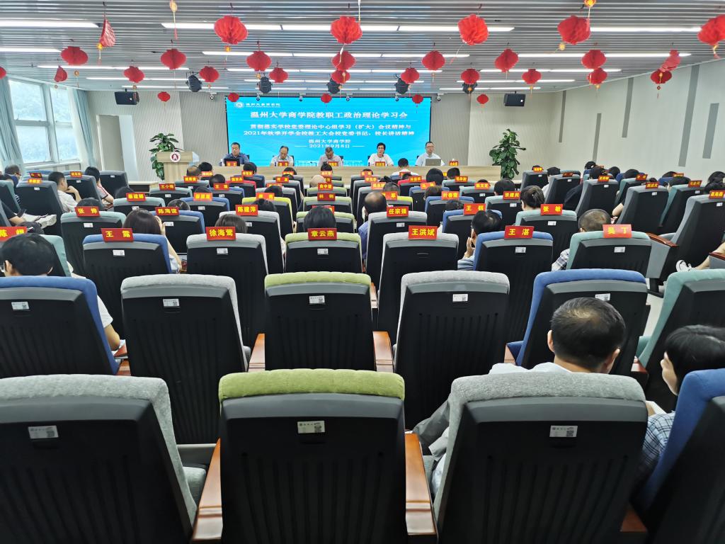 在信息楼A226仲辉商道讲堂举行2021-2022学年第一学期开学教职工理论学习大会,全体教职工参加学习会,会议由学院党委书记郑彩莲主持。
