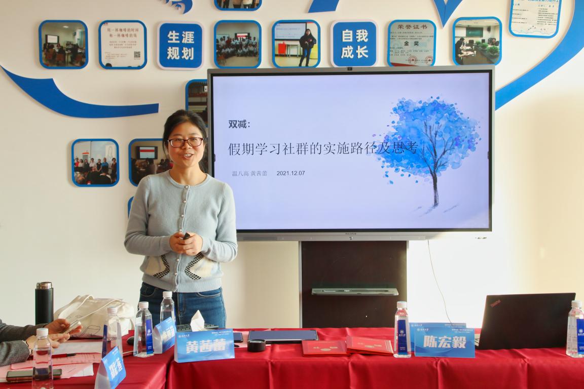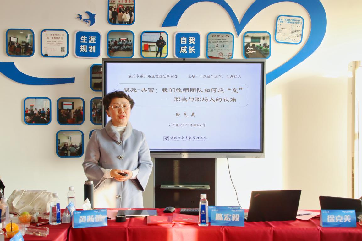 校友与发展联络办主任陈宏毅聚焦《MBTI在职业生涯中的运用》进行阐述,并且就具代表性的性格进行了分析,认为“双减”之下,内驱力和自我管理能力,成为核心竞争力;温州市第八高级中学高级教师黄茜蕾在题为《双肩背景下学生学习共同体的实践与思考》发言中依据恩格斯托姆活动理论制定假期学习社群的实施路径,并利用可视化成果和多元化激励机制来对假期学习社群的成效进行反思;温州市教育教学研究院教授徐克美结合自己的独特视角,在题为《双减+共富:我们教师团队如何应“变”—职教与职场人的视角》的发言中指出,社会巨变波及我们每一个人,影响着我们的时间、方式、地点和原因,进而影响我们对职业生涯的规划及追求。应对“双减”的改变是为了更好应变才能够变得更好,打破行业、校际、学段和学科的隔阂,教师才能真正体验职业的幸福感。