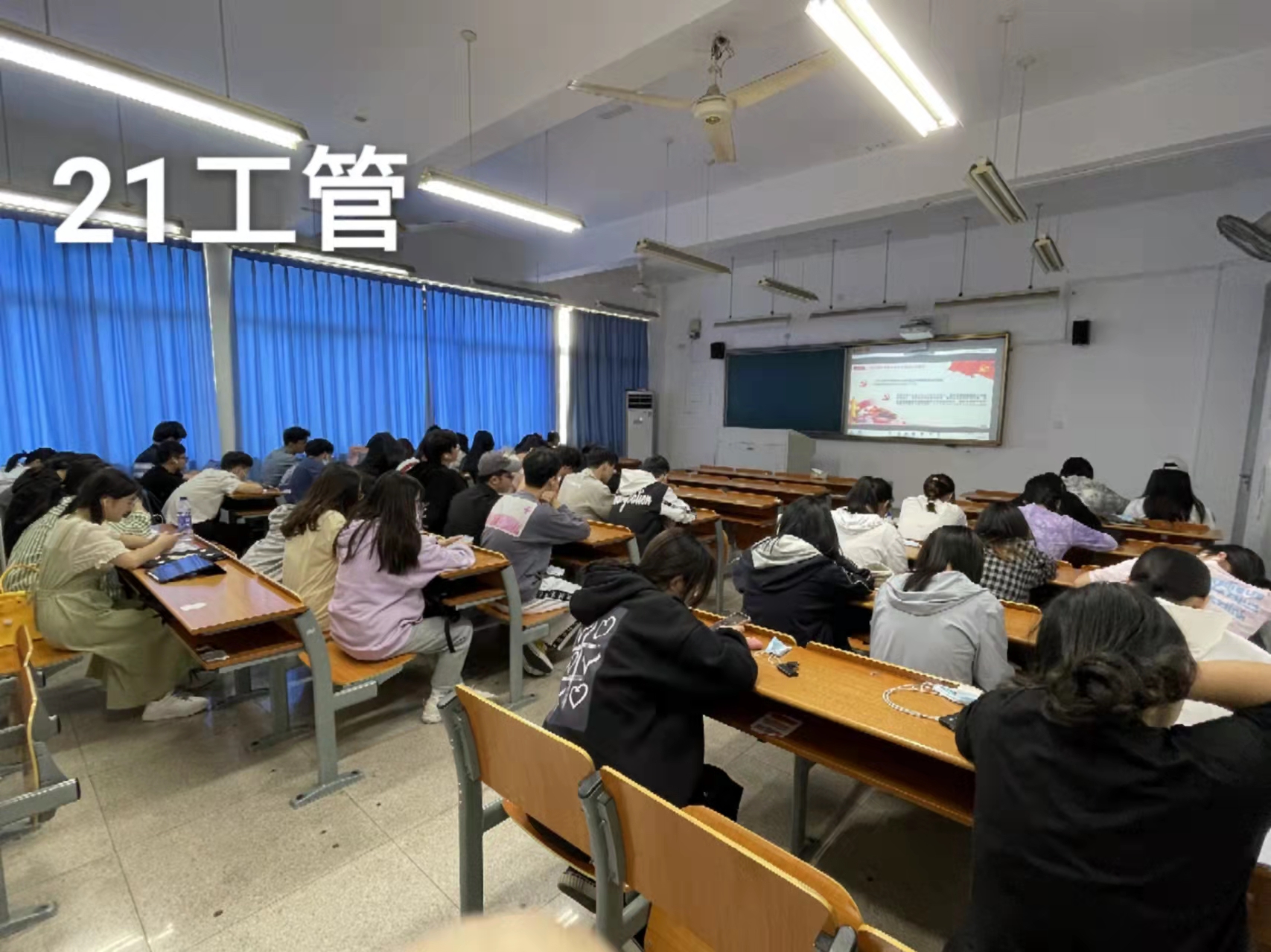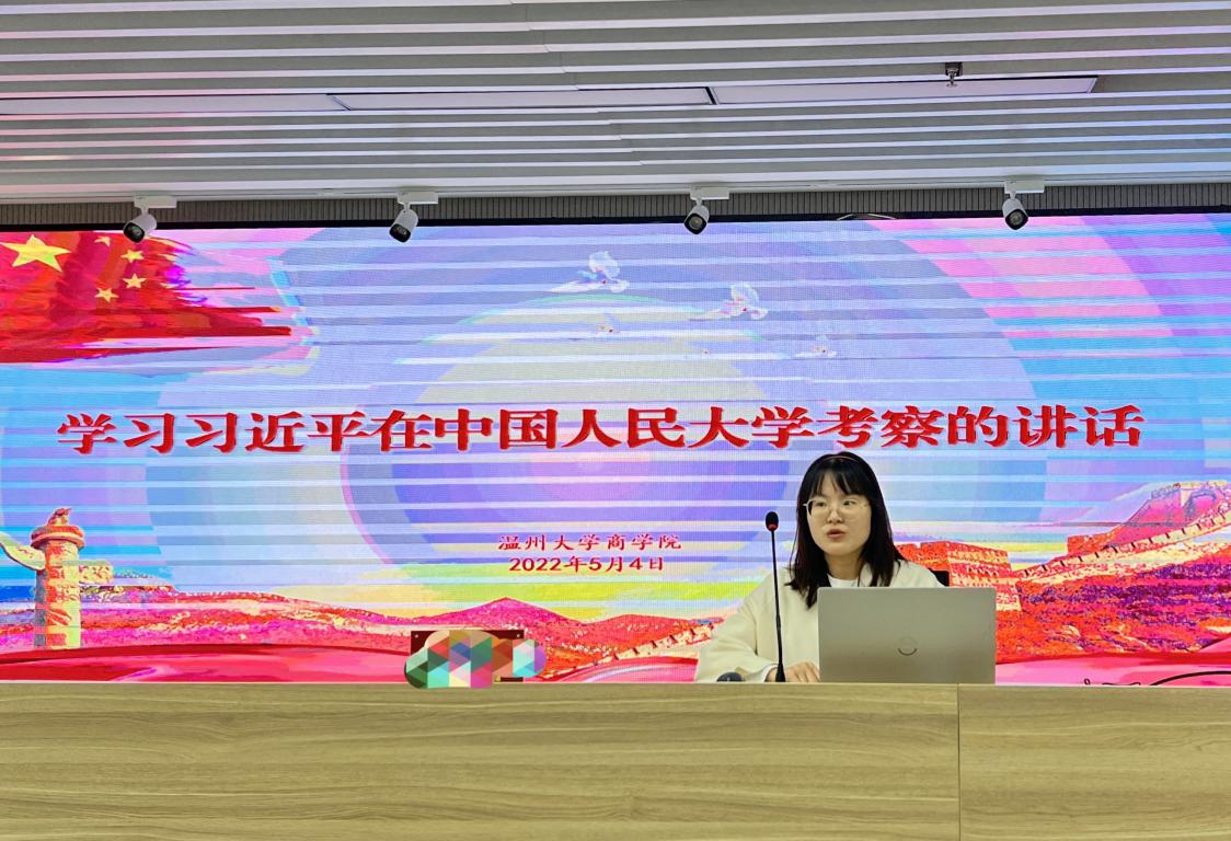 19级应用经济学研究生陈慧倩带领同学们一起学习“习近平总书记在中国人民大学考察时发表的重要讲话”,希望同学们能够传承红色基因,赓续红色血脉;坚定青春信仰,学好讲好思政课;争做时代新人,肩负民族复兴重任。理论学习最后,陈慧倩同学讲到,实现中华民族伟大复兴是一场接力跑,作为新时代的青年,同学们应不畏惧前进道路上的一切艰难险阻,学会在担当中历练,在尽责中成长,为实现中华民族伟大复兴而奋勇拼搏,让青春之花在不懈奋斗中绚丽绽放。