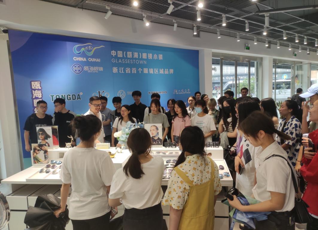 接着一行人来到了朗盛光学有限公司的线下销售门店参观,在设计总监Leo的讲解下同学们了解到眼镜框背后的故事。