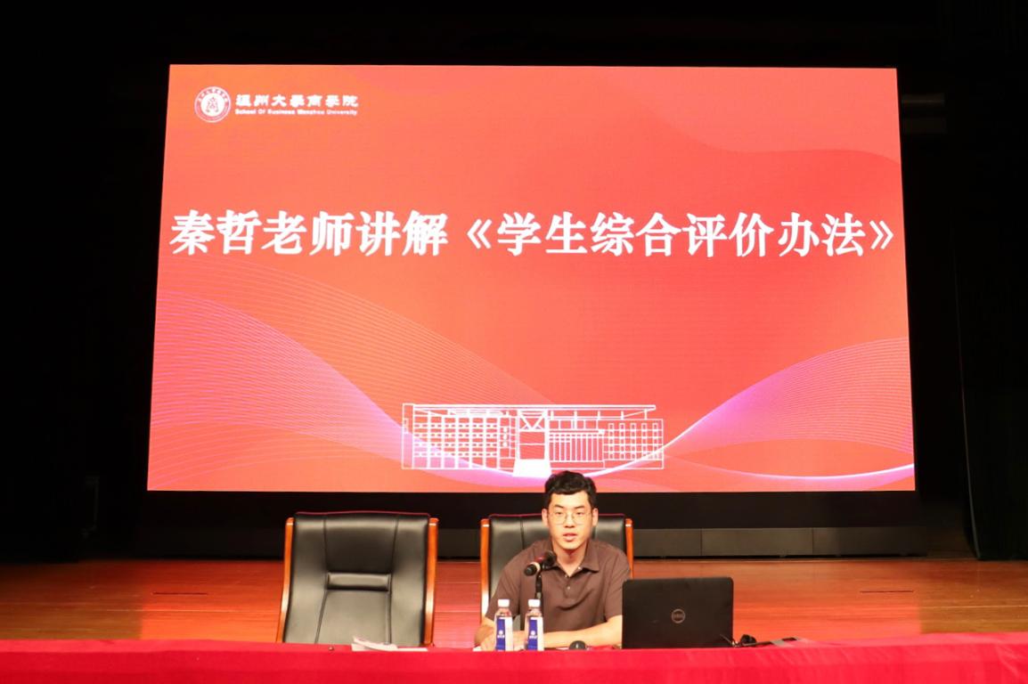 随后,辅导员秦哲老师仔细分析并解读学生综合素质评价与奖励办法,分别讲解奖、助、学、贷等各方面政策,帮助新生对相关的评定有更深地了解,有利于新生尽快走出开学之初的迷茫状态,确定努力的方向,树立学习和奋斗的目标,做好学习规划,创造美好充实的大学时光。
