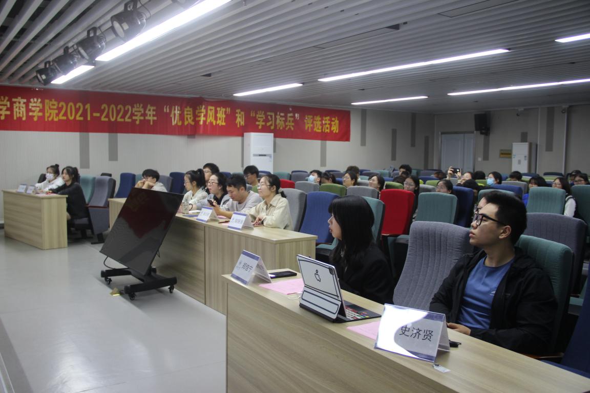 2021-2022学年“优良学风班”和“学习标兵”评选活动在商院楼A226会议室举行。院学生科辅导员周洁文、聂海燕、张元祝、张春洋、胡施施,院学生会主席团成员等出席并担任评委。各新生班级代表参与现场观摩。