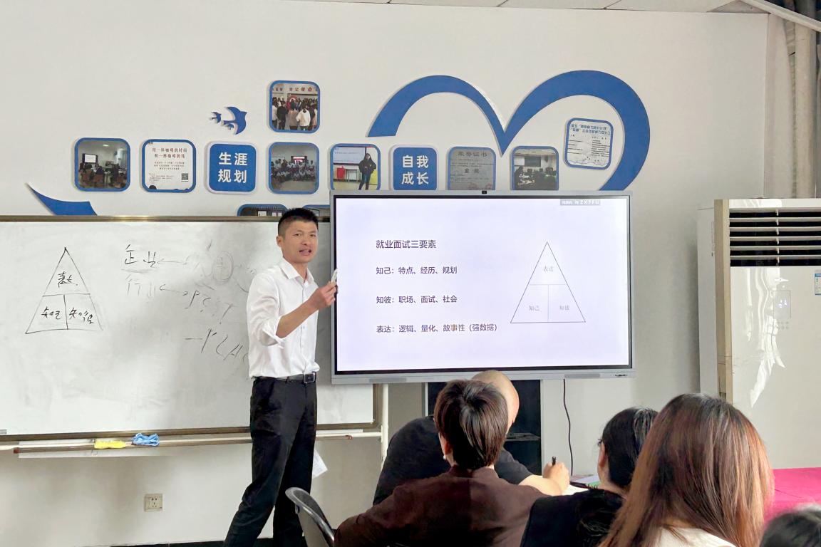 学工部副部长王壮分享了“面试攻略三要素”,从“知己、知彼、表达”三个方面进行详细分析。他指出,学生应该根据自身的特点、经历和未来规划进行针对性的训练,做到认清职场、认识面试、融入社会,在表达上注重逻辑提升,量化成果,通过故事性的介绍加深面试官的印象,实现最佳面试效果,助力学生就业,同时也有效推进生涯教育在服务学生方面的不断发展。