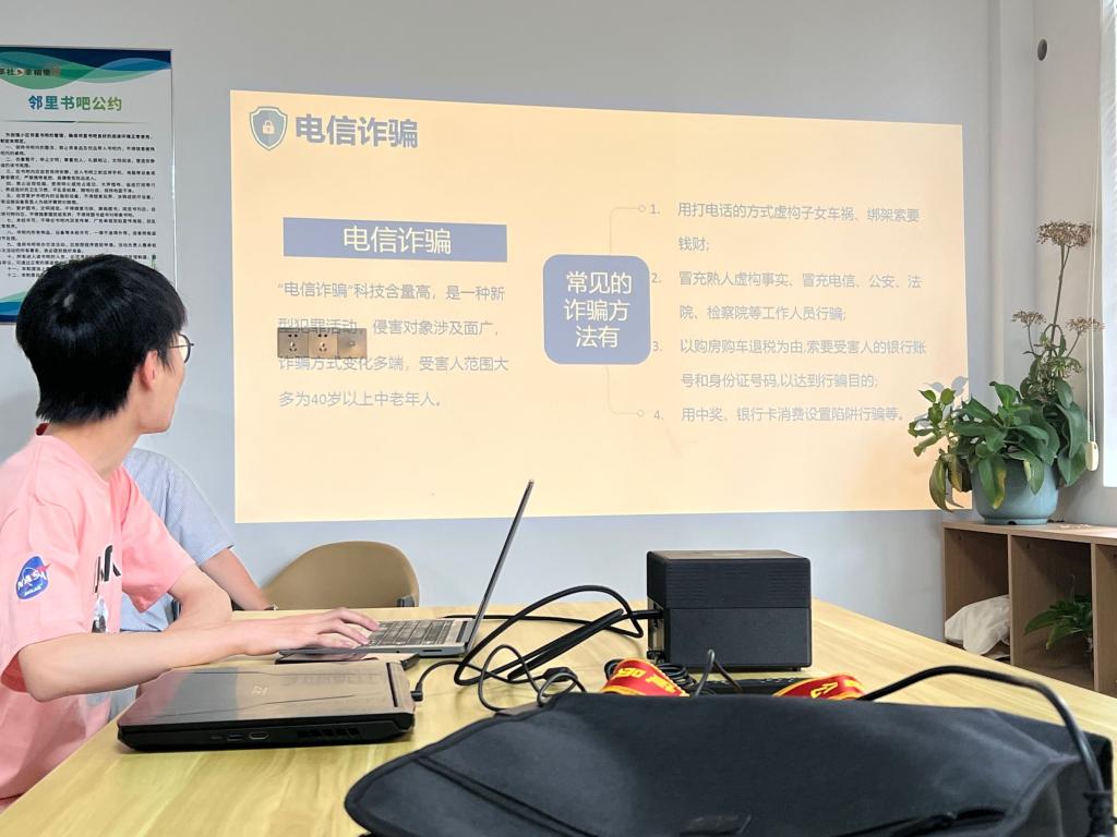 首先,陈家乐同学以通俗易懂的语言,生动形象地向居民们介绍了申辩各种常见的诈骗类型,包括电信诈骗、街头诈骗、网络诈骗、婚姻诈骗、银行卡诈骗和招生诈骗等,让居民们更加深入地了解了诈骗的危害性和防范的重要性。同时,陈家乐同学还结合实际案例,从多个角度阐述了各类诈骗的典型特征和识别技巧,向居民们展示了如何识别和防范各类诈骗,让居民们掌握了一些实用的防范技巧,帮助居民们对于身边的骗局时刻保持警醒,并练就一双火眼金睛。