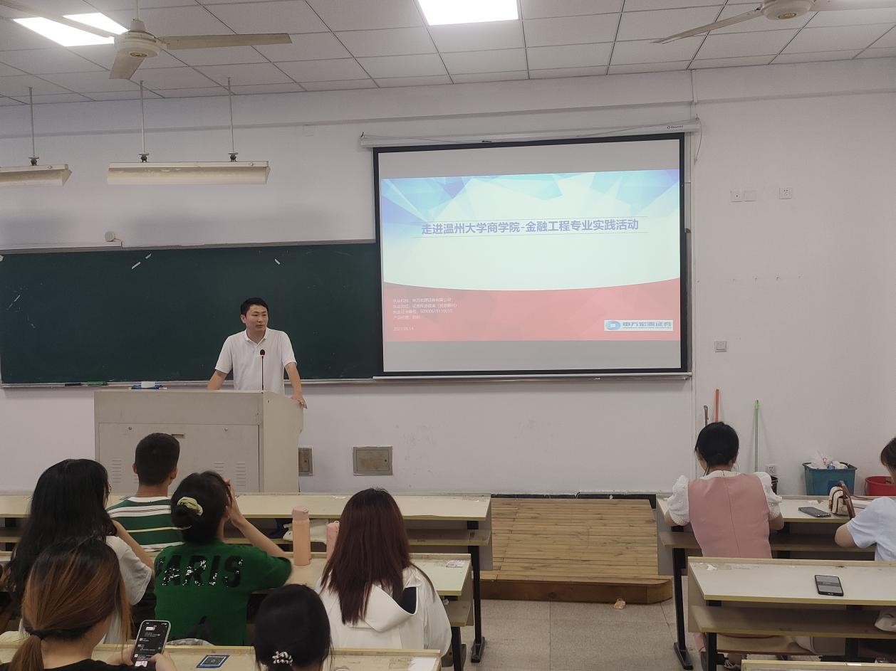 金融工程系于2023年6月14日在北3-401教室展开专业见习讲座,本次讲座特别邀请了申万宏源证券温州分公司机构金融部经理林陈娥、资深投资顾问陈科、财富管理部经理陈时察,深入交流证券行业的行业发展和了解大学生防诈与证券防诈的相关知识。