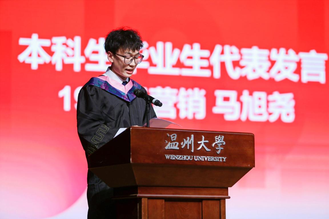 原团委学生会主席、19市销班马旭尧同学作为本科生毕业生代表发言,他回顾了当年报考成人电影