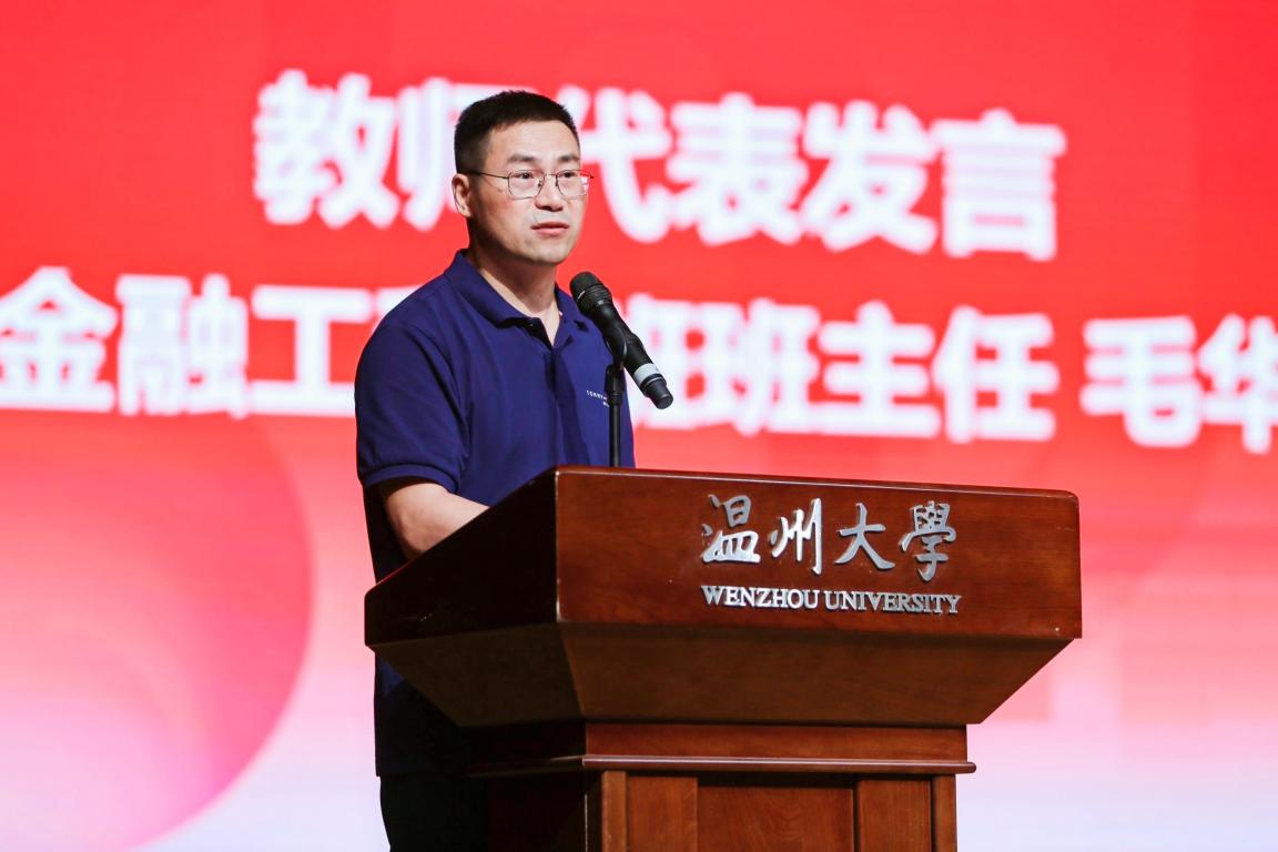 党委委员、毕业班19金融工程1班班主任毛华配老师作为教师代表发言,他回首了这漫长又短暂的四年,和同学们一起学习、一起奋斗、一起进步的时光。临别之际,他怀着高兴又不舍的心情对毕业生们提出四点建议与希翼:一是善待自己,用梦想照亮人生;二是保持学习,保持阳光的心态,三是学会感恩,回馈社会与国家,四是不断精进,完成自我超越。最后,他祝愿学生们在新的征程中不忘初心,一路成长!