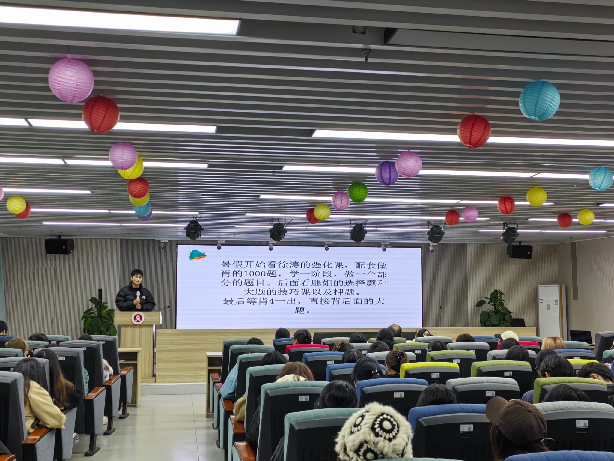 育人理念和学院今年考研数据和就业数据等,客观分析了当前考研的形势,接着从为什么要考研、如何备考两个方面为同学们进行了深入浅出的讲解,鼓励同学们在考研之路上要敢于有梦、勇于追梦、勤于圆梦。唐书记也给备考学生提出三点期望:要善于借鉴考研经验,认真做好考研准备,以及树立“咬定青山不放松”的精神。