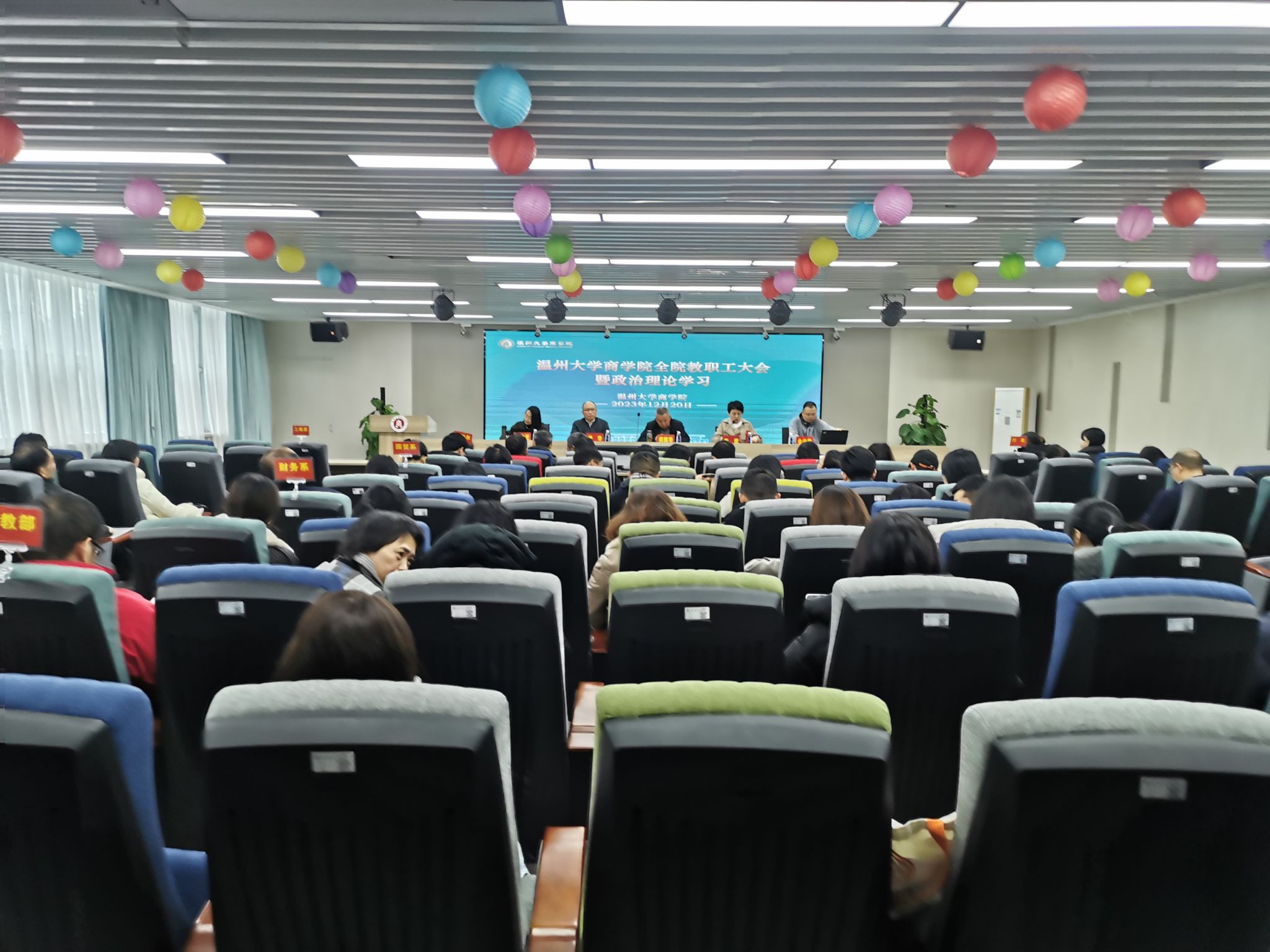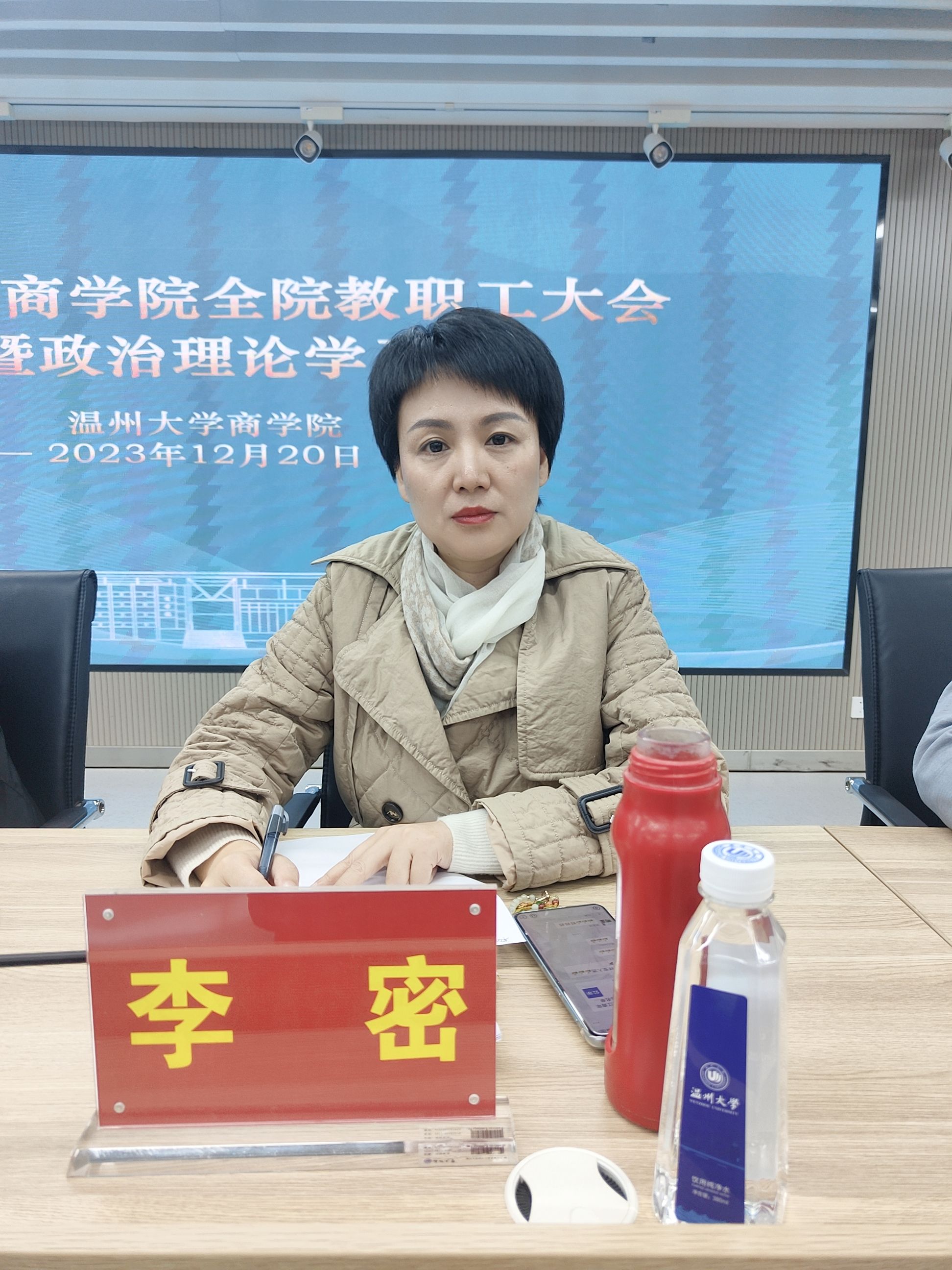 在仲辉商道讲堂举行全院政治理论学习暨主题教育调研报告成果交流会,全体教职工参加会议,会议由学院党委书记李密主持。