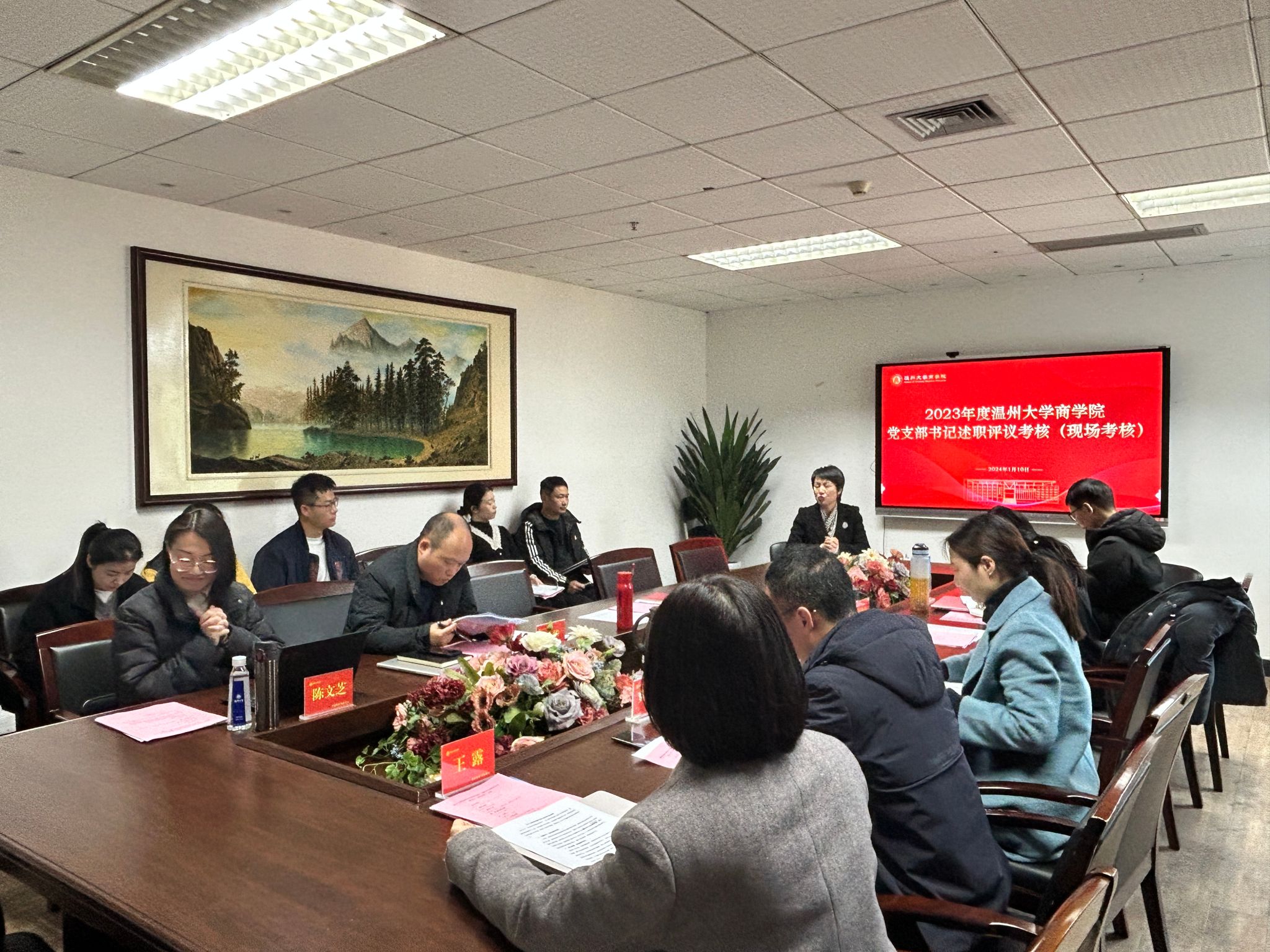 紧接着,13个师生党支部书记分别作述职报告。2023年,学院各师生支部纷纷围绕学习党的二十大精神、习近平总书记系列讲话精神、践行“八八战略”、“循迹溯源学思想促践行”、金融教育基地建设等主题,开展了形式多样的学习和活动。各支部书记逐一介绍了本支部工作的亮点和成绩,同时结合本支部党建工作中的薄弱环节和突出问题,如党建活动形式单一、党建与学科专业融合不深入、党员组织关系未及时接转和落实等,查找自己在履职尽责方面的差距和不足,并提出有针对性的解决措施和办法,明确2024年党支部建设的努力方向和目标任务。13个师生党支部书记述职之后,现场评议,评选出4个表现突出的党支部。