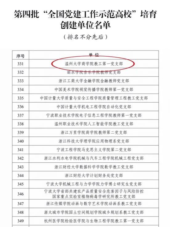 首届“十佳支部书记”等诸多荣誉;支部成员获评新时代浙江省“万名好党员”“全国文科应用转型改革名师”“浙江省高校领军人才”“浙江省本科教学指导委员会委员”“温州市百名社科青年骨干人才”以及浙江省哲学社会科学优秀成果奖二等奖3项、三等奖2项。指导学生获得“挑战杯”全国大学生课外学术科技作品竞赛二等奖、三等奖各1项,浙江省国家奖学金特别评审奖1名(全省仅10名)。一个学生团支部获得浙江省优秀团支部。
