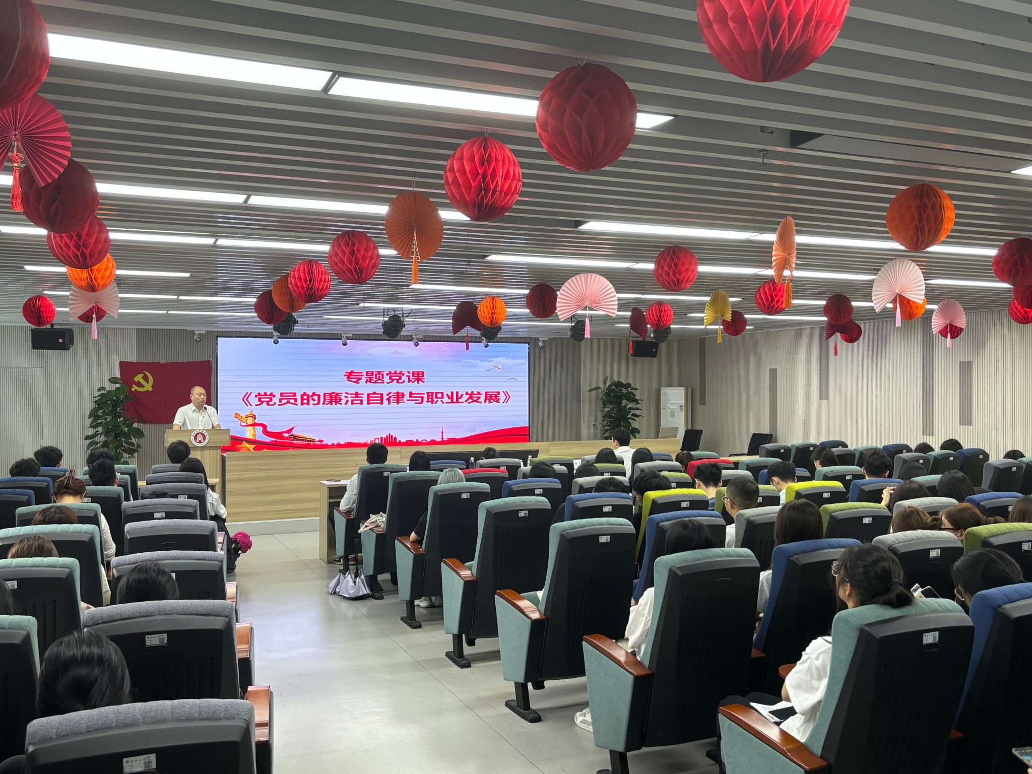 最后,为帮助毕业生党员扣好廉洁自律的“第一颗扣子”,学院党委书记唐华老师结合党纪学习教育为毕业生党员们带来专题党课《党员的廉洁自律与职业发展》。他强调了党员党性修养与政治站位的重要性;同时,他指出廉洁自律不仅是党员个人品德的体现,也是职业发展的重要保障,以此教育引导毕业生党员在未来的职业生涯中,要始终以党员的标准严格要求自己,做到清正廉洁,自觉抵制各种诱惑和腐蚀,通过实际行动,展现党员的良好形象,赢得同事和社会的尊重与信任。唐华书记还专题领学了习近平总书记关于宗教工作的重要论述。
