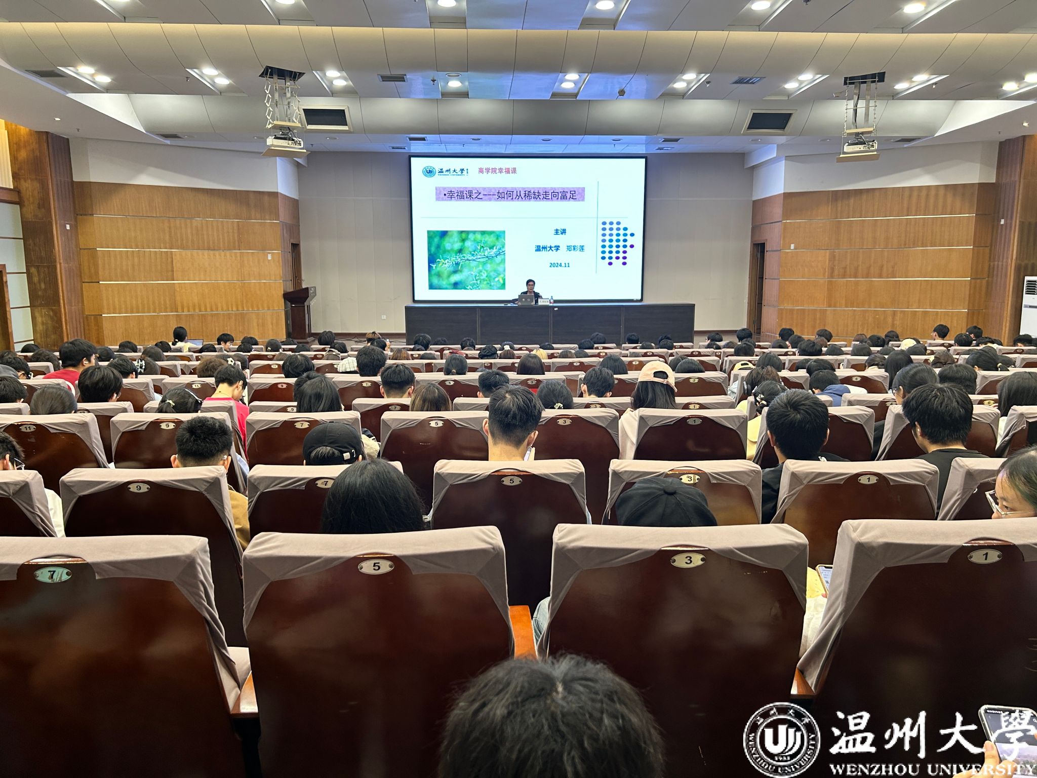 特邀学校人事处处长郑彩莲老师为学院全体大一新生带来主题为“如何从稀缺走向富余”的心理幸福课。