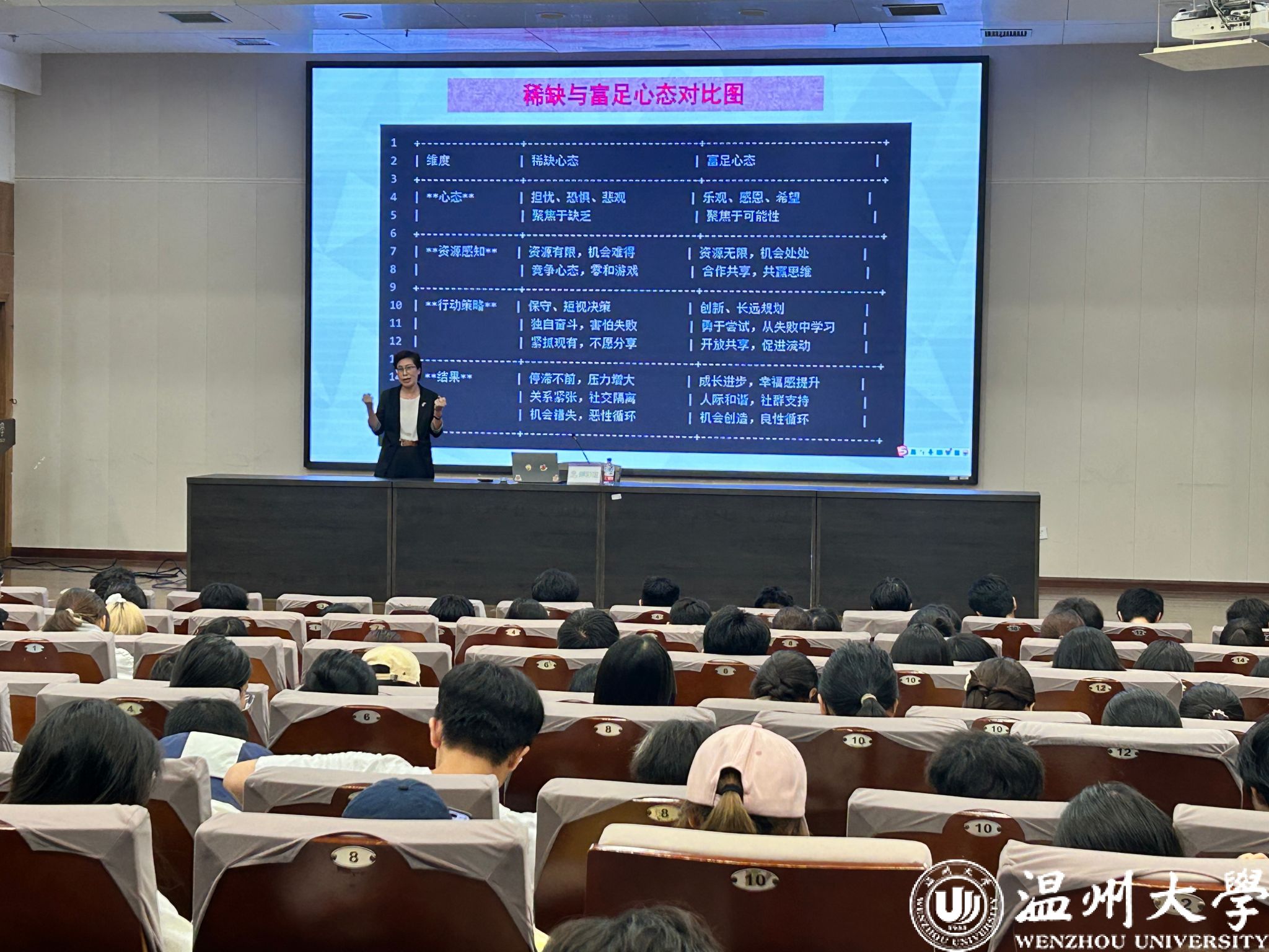 幸福课伊始,郑彩莲老师以“稀缺”为切入点,深入浅出地探讨了这一概念对个体心态的影响。她借助一系列鲜活的案例,生动形象地引导同学们深入反思自身的精神状态,真正认识和理解“稀缺”本质。她指出,生活中大部分人会常常陷入“稀缺”状态,而忽视了内心的需求和精神的富足,进而在无形中左右着大家的生活与学业,对决策和行为方式带来负面影响。