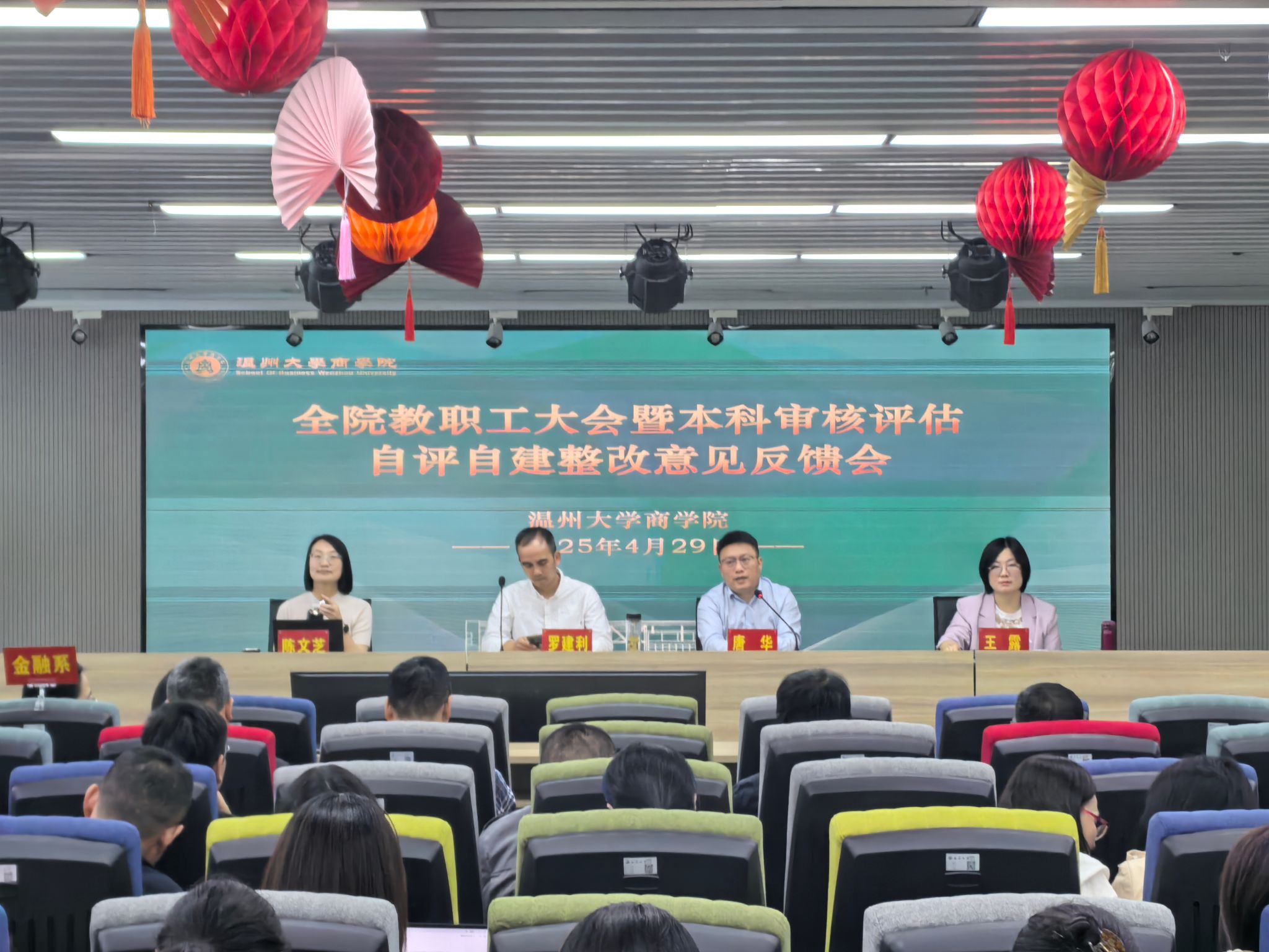 在商院楼A226仲辉商道讲堂举行全院教职工大会暨本科审核评估自评自建整改意见反馈会,会议由学院党委书记唐华主持,学院全体教职工参加。