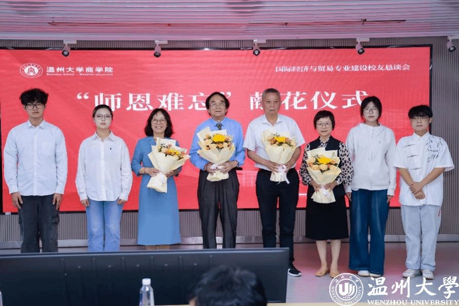 党委副书记庄兴忠、浙江省商务厅综合发展处处长杨颖俊、温州市商务局副局长林松青,鹿城区商务局、瓯海区商务局、温州市外贸协会、温州市跨境电子商务协会、鹿城区跨境电子商务协会等商协会领导,国贸系老教师代表盛培林、朱晓申、戴静,老领导代表胡振华,40余位各届国贸校友,全体班子成员、国贸系全体教师、在校国贸班班长等共计120余人参会。