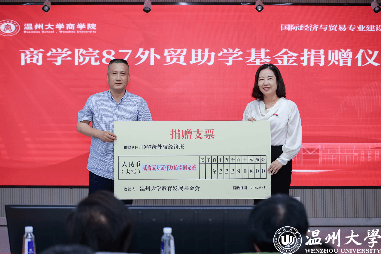 在庄重的捐赠仪式环节,85外贸两位校友捐赠300万成立“書立基金”,87外贸班全班同学共同捐赠22万成立“87外贸助学基金”等,还有多位国贸校友捐钱捐物襄助学院办学。