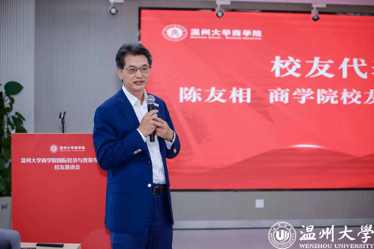 第二届校友会会长、中宁化集团董事长、首届85外贸经济校友陈友相发言。陈会长以“青葱岁月”为主线,深情讲述求学时期的趣闻轶事,感恩母校培育之情,并勉励商院学子商启未来,勇敢书写人生华章。