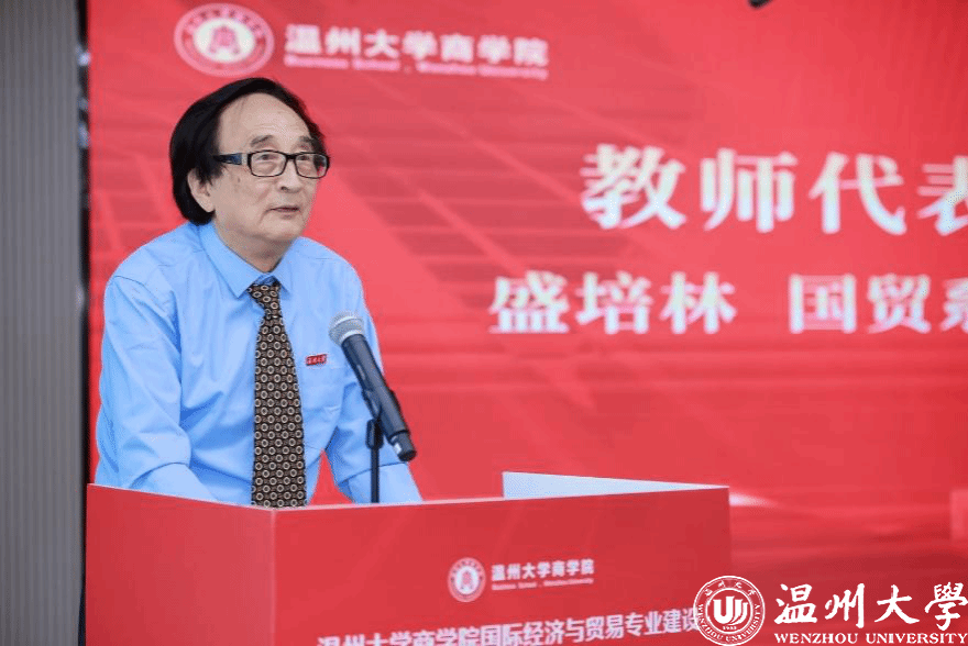 国贸系教师代表盛培林讲话。盛老是国贸系1985年启动招生后的首任教研室主任,他细数专业建设四十年风雨历程,从初创时期的筚路蓝缕谈到今日桃李满园的盛况,寄语后辈接续奋斗,矢志培育具有国际视野的经贸英才,为新时代对外开放事业再立新功。
