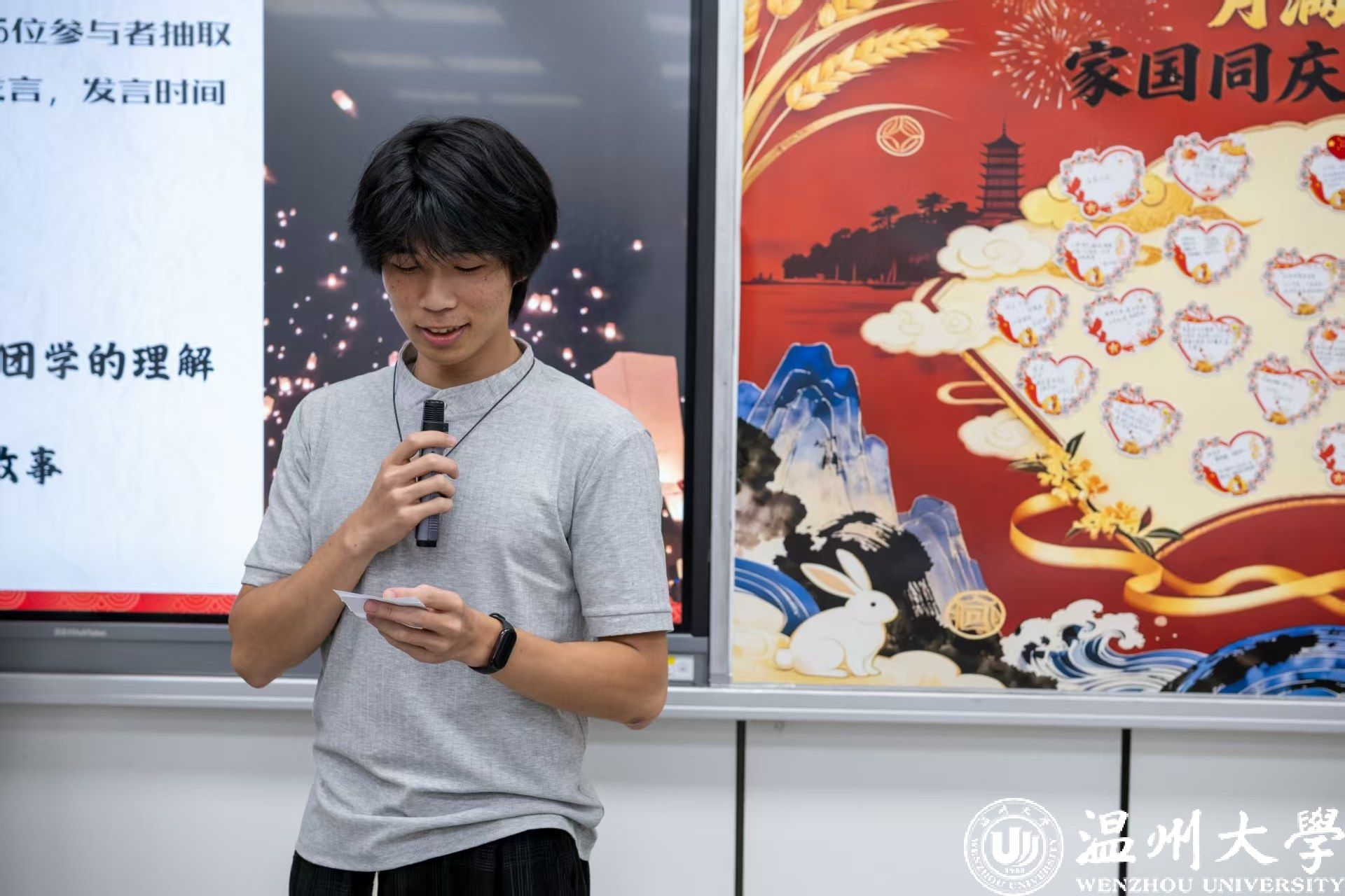 压轴登场“家国盲盒”环节主持人随机报出号码,15 位幸运成员依次抽取话题盲盒,围绕 “九三阅兵观后感”“对团学工作的建议”“中秋主题故事分享” 等话题展开 1 分钟即兴发言。“九三阅兵时,看到威武的军队、先进的装备,我真切感受到祖国的强大,也更加坚定了努力学习、报效祖国的决心”“希望团学未来能多开展跨部门合作活动,让大家有更多交流机会”…… 真挚的话语、独到的见解赢得阵阵掌声,每位发言者还从奖品盲盒中抽取了月饼礼盒等惊喜礼品。