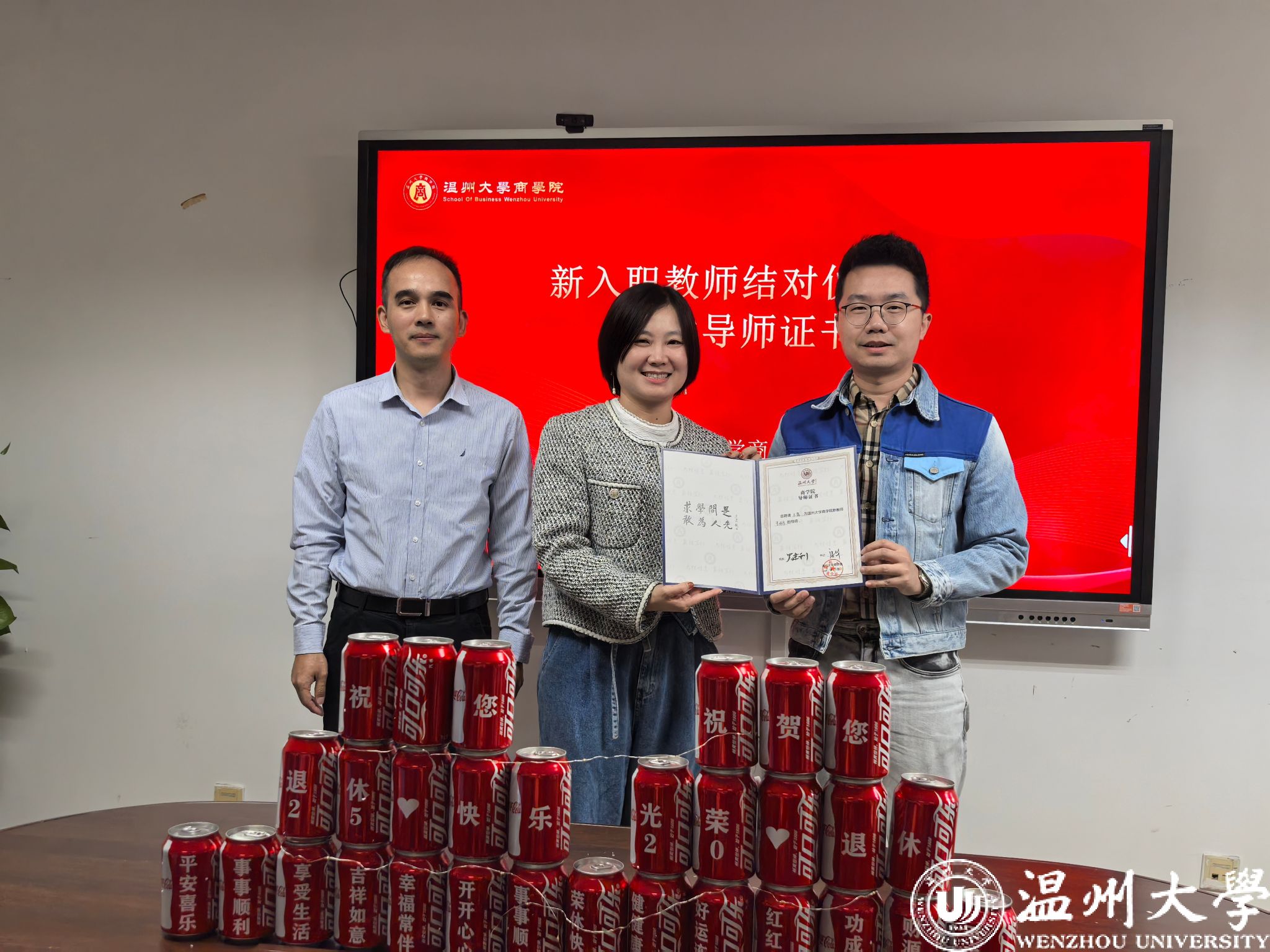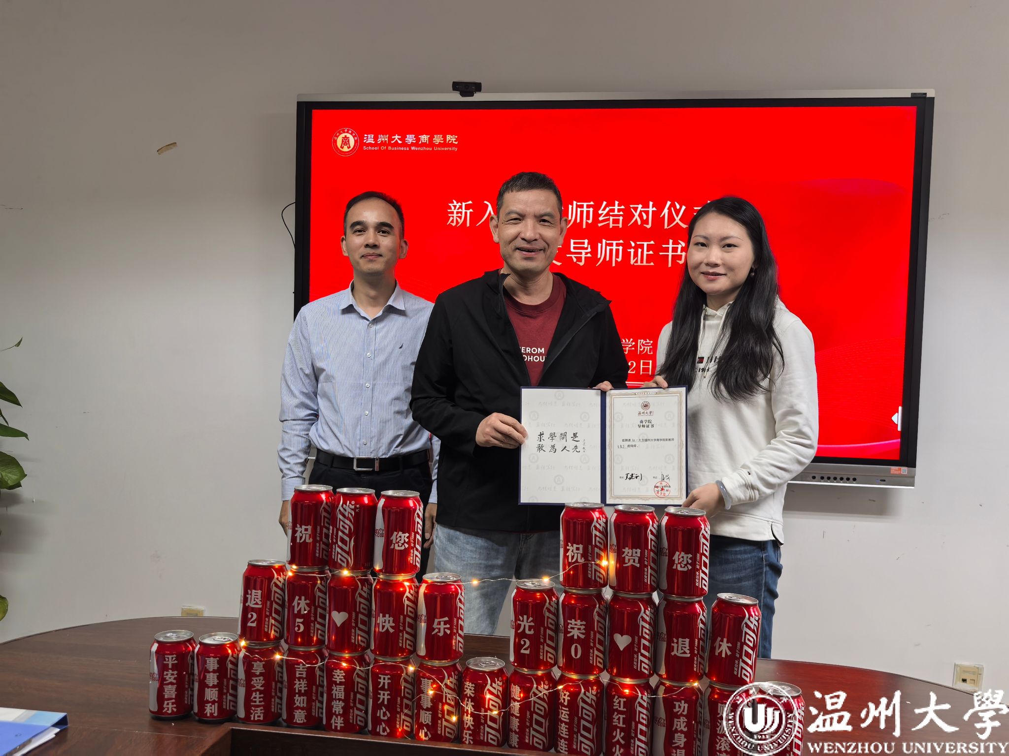 在全场热烈的掌声中,仪式进入新教师入职主题环节。罗建利院长、唐华书记为王若丁、李泽宇两位新教师颁发入职证书,两位教师的加入将为学院教学科研创新、国际化建设注入新的活力。随后,为助力新教师快速适应岗位、提升教学科研能力,学院举行新入职教师结对仪式,聘请张一力教授担任王若丁老师教学导师,王露副教授担任李泽宇老师教学导师。罗院长为导师颁发聘书,以“传帮带”的优良传统,为新教师成长搭建坚实平台。