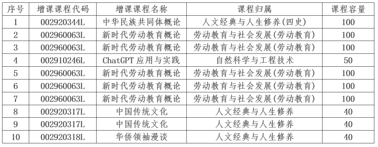 公选课增加课程详见下表