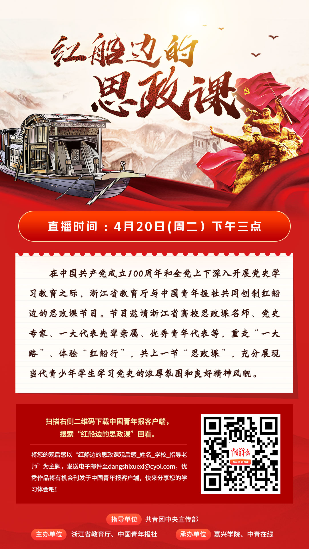 直播时间:2021年4月20日(周二)15:00至16:00,直播地址:中国青年报App客户端(进入客户端搜索“红船边的思政课”,客户端、PC端直播链接//news.cyol.com/gb/live/articles/2021-04/15/content_KEVGmHBbA.html);“教育之江”微信公众号、浙江高校网络思想政治工作中心、“之江汇”教育广场等平台将提供相关观看渠道。