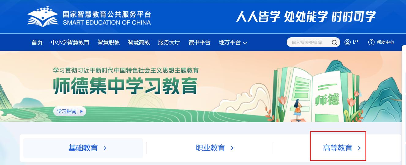 (一)注册。通过国家智慧教育公共服务平台(www.smartedu.cn)进入“师德集中学习教育”专题,点击“高等教育”(如下图)入口进行实名注册后可报名学习。