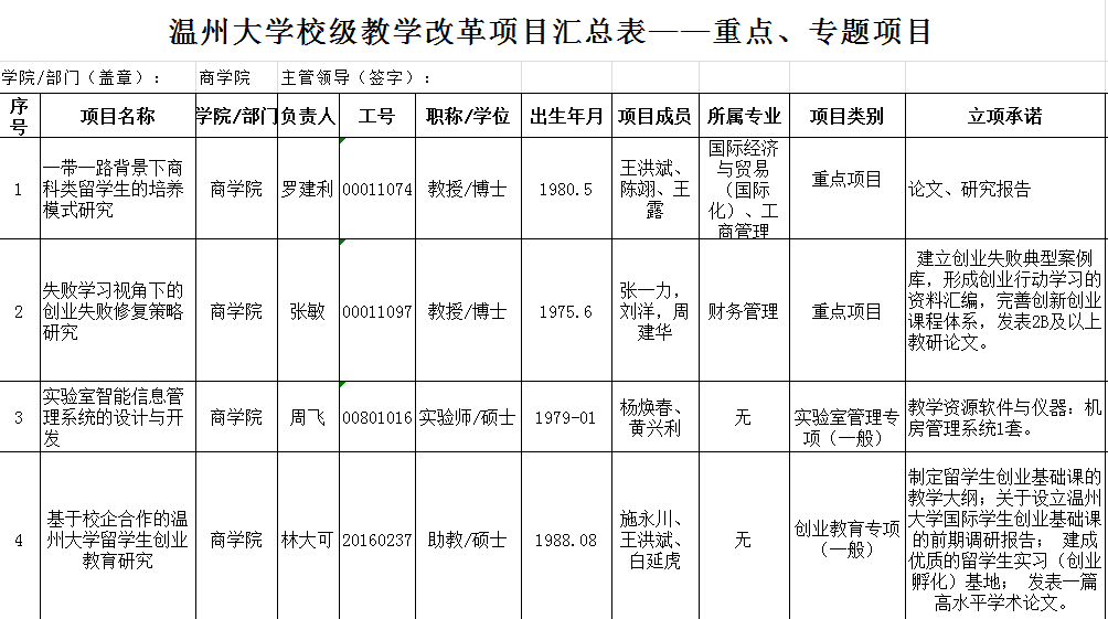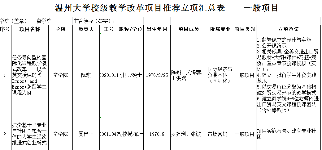 课堂教学创新行动计划》(温大行政〔2014〕269号)的文件精神,我院组织开展了2018年校级教学改革项目立项评审工作。经学院专家评审同意《任务导向型的国际化课程教学模式改革——以全英文授课的《Import and Export》留学生课程为例》等2项推荐立项为一般项目、《一带一路背景下商科类留学生的培养模式研究》等4项推荐参与学校重点项目及专项项目的评审,现将具体名单予以公示,公示时间为三天(4月10日-4月12日),如有老师对结果有异议,请与教学科徐老师联系,联系电话86680957。