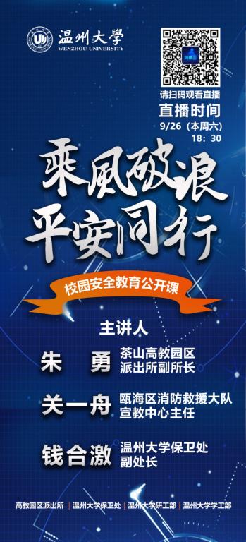 为认真贯彻落实《浙江省教育厅办公室关于进一步加强校园贷和电信网络诈骗风险防范工作的通知》精神,切实做好校园安全宣传教育,增强广大师生员工的安全防范意识,提高安全风险防御能力,助力平安温大建设。决定面向全校师生员工开展 “同上一堂校园安全教育公开课”活动。现将有关事项通知如下: