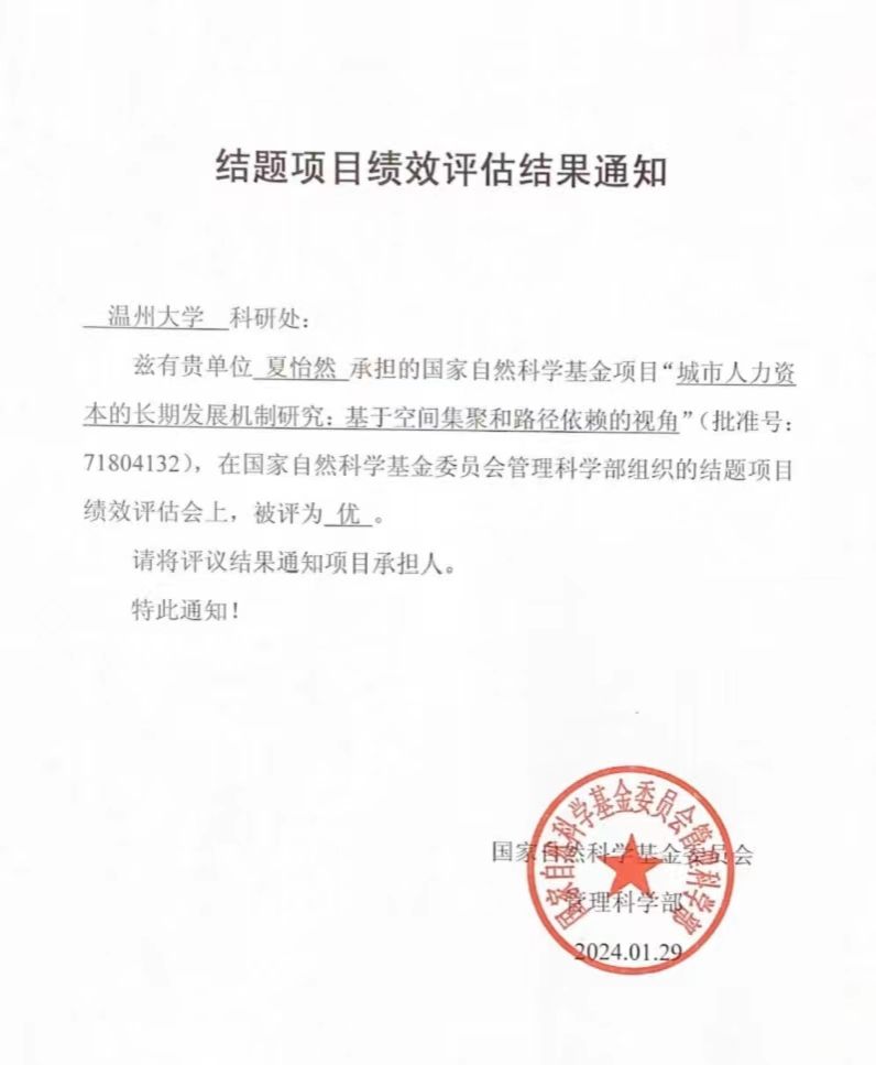 【喜报】我院夏怡然教授国家自科项目结题绩效评估获优
