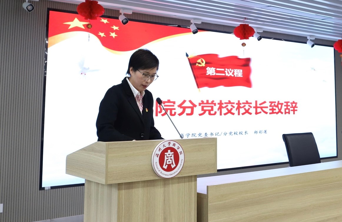 分党校校长郑彩莲上台致辞。她提出“为什么学”、“怎么学”、“学了干什么”三个问题引导学生党员骨干们思考;同时也希望学员们通过培训切实提高政治能力、调查研究能力、科学决策能力、改革攻坚能力、应急处突能力、群众工作能力、抓落实能力,成为一批政治坚定、思想过硬、德才兼备、勇挑重担的优秀青年党员骨干队伍。随后,本次培训班班主任魏梦瑶老师宣读了《学员守则》,同时也希望各位学生党员骨干在接下来学习中遵守守则,服从班级管理,以党员的要求严格要求自己,认真学习,在思想上有所收获。开班仪式最后,三位校长向学员代表们赠送学习资料。