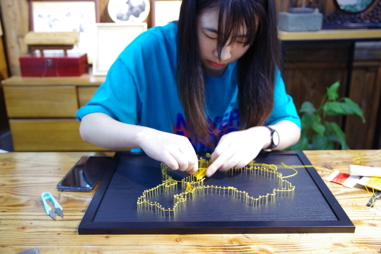 本次的参观体验中,青年党员们参观了活字印刷、丝网印刷、古法造纸、扎染、凸板印刷、雕版印刷、古法装帧等传统工艺项目,又进一步观看学习了弦丝画的制作视频,深入了解弦丝画的制作过程,更是亲自动手现场体验。在现场老师的指导下,青年党员们一个个亲自动手拿着钉子拿着锤子,一锤一锤的构建出中国的版图。一根根金色的丝线一抻一拉,渲染出了一个金色的中国。首都的位置用红线勾勒出一个鲜红的爱心,这不仅仅是代表着首都的位置,更彰显着青年党员们对祖国炽热的爱。