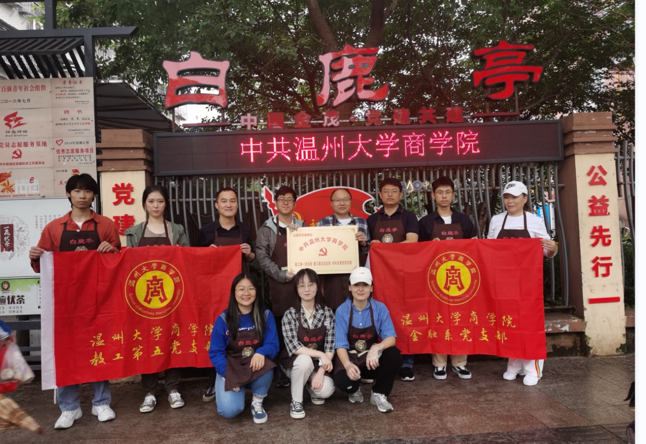 教工第五党支部联合教工第一党支部、本科生第四党支部,组织党员同志来到白鹿亭开展主题党日活动——白鹿亭公益早餐行,公益岗位由慈善联合会会长邵智敏统筹安排。