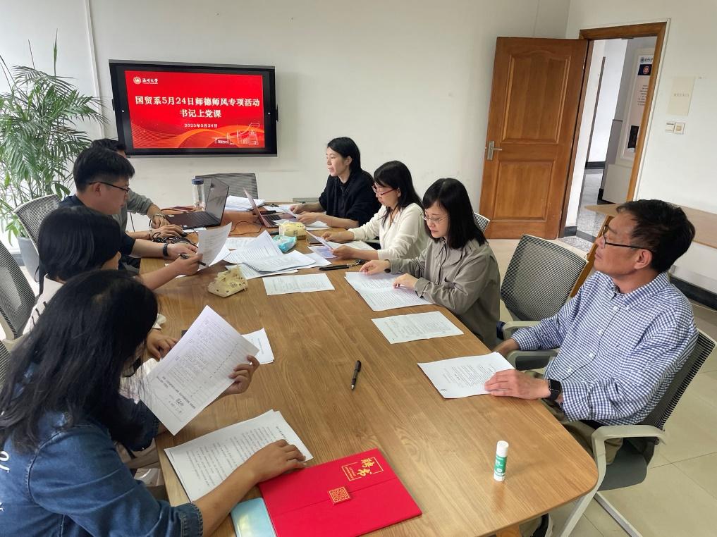 教工第二支部在北校区商学楼A308A办公室召开师德师风专项学习会,会议由支部书记蔡星星同志主持,支部党员及国贸系教师参加。此次师德师风专项学习会采取支部书记领学,并组织教师进行自查,开展批评和自我批评。