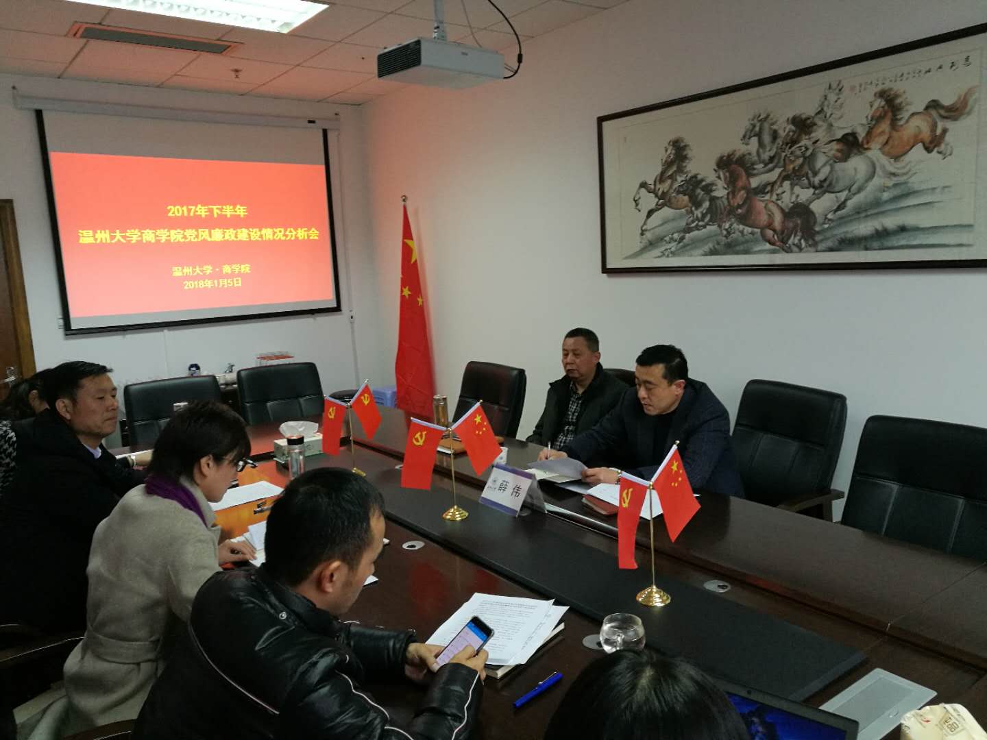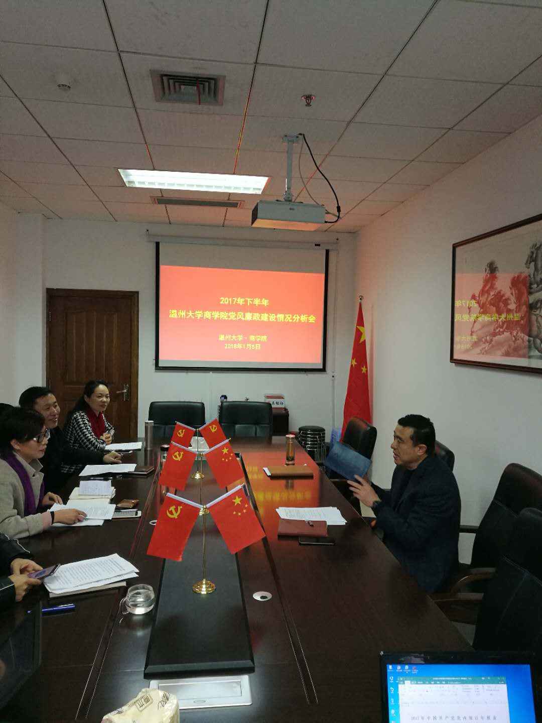2018年1月5日下午,我院党总支在信息楼A223党员之家召开2017年下半年党风廉政建设情况分析会。院党总支书记郑彩莲、院长胡振华、副书记刘开练、副院长罗建利、副院长林俐、院长助理王洪斌参加了本次会议。学院联系校领导薛伟副校长全程参加了会议。会议由院党总支书记郑彩莲主持。