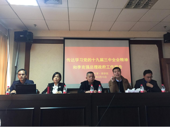 党总支在A301集中传达学习党的十九届三中全会精神和李克强总理政府工作报告,院长胡振华、党总副书记刘开练、副院长林俐、罗建利,院长助理王洪斌出席会议,学院全体教职员工参加了会议。