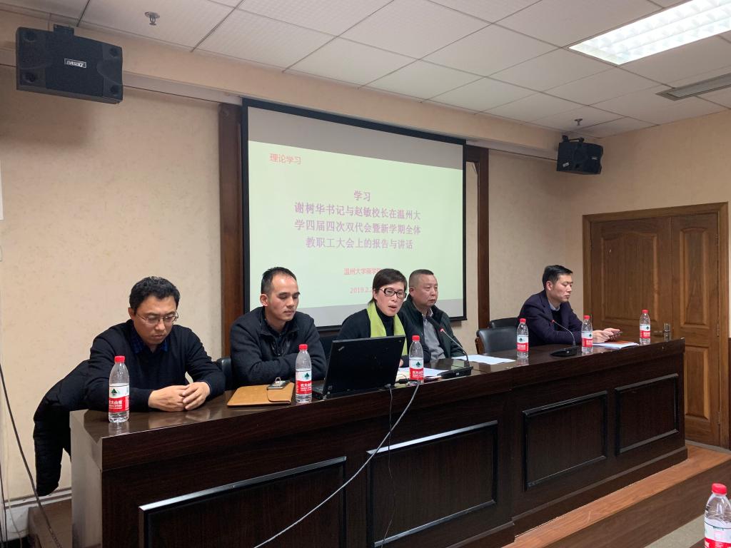 会上,与会老师共同学习了四届四次双代会报告内容,重温“教学研究型大学”、“升博”、“省重点高校”等报告关键词。深入解读了赵敏校长题为《改革创新再深化不忘初心再出发在抓住用好机遇中书写新时代学校发展新篇章》的工作报告。报告指出2019年学校的重点工作是全力创建博士学位授予单位和省重点建设高校,学校工作应围绕“凸显以本为本核心理念,推动科研创新持续立功,坚持卓越师资汇聚强校,深化高等教育对外开放,压实全面从严治党责任,推进智慧平安校园建设”等六个方面重点开展。