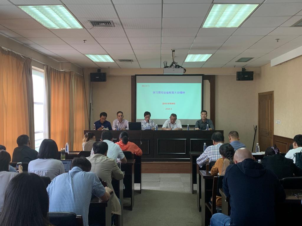 会议还学习和传达了5月16日浙江省教育厅厅长陈根芳在温大调研会上的讲话精神。会议指出,我校正处于努力实现“三大目标”的发展关键期,如何为学校跨越式、超常规发展做出贡献,需要全院上下继续强化思想引领,高度关注学校发展,需要学院师生积极参与服务地方,服务企业,服务群众,积极投身国家与地方战略,需要学院聚焦优势,提升水平,凝聚全体教师力量,坚持底线保障,又稳又快发展。
