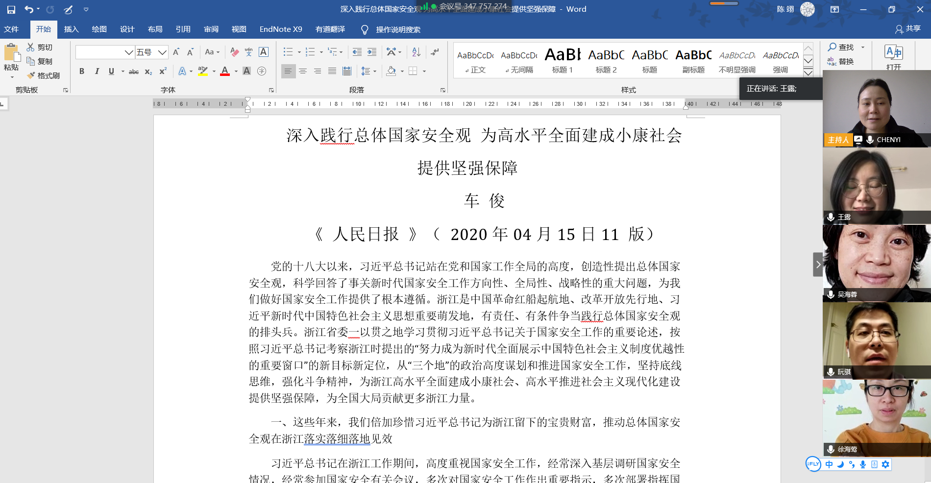 此次支部学习的主要内容是2020年4月15日省委书记车俊发表在人民日报上的文章《深入践行总体国家安全观,为高水平全面建成小康社会提供坚强保障》。文章回顾了习总书记在浙江工作期间对国家安全工作的相关指示和建设,指出要牢固维护国家安全的思想根基,筑牢维护国家安全的“四梁八柱”,全面加强国家安全体系和能力建设,构筑浙江的“铜墙铁壁”。特别是现在,仍然处在新冠肺炎疫情,国内外压力很大,浙江要运用国家安全体系的威力为应对疫情冲击,加速复工复产,把牢社会稳定安全阀,织严生物安全防护网。