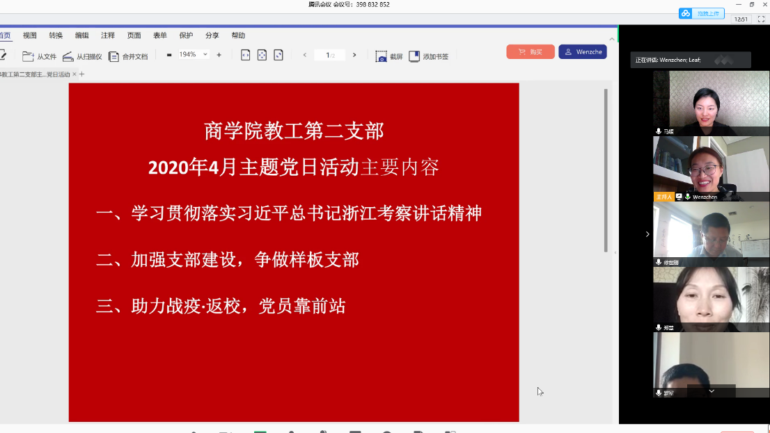 教工第二支部利用腾讯会议开展了线上主题党日活动。支部8名党员参加会议,会议由支部书记陈文芝老师主持。