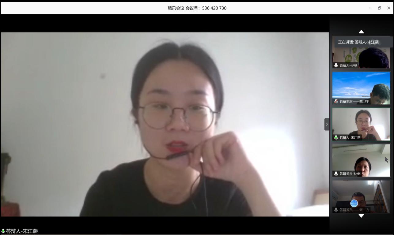 的硕士研究生线上答辩如期展开。答辩分为两组,每组7名答辩人在腾讯会议平台通过视频通话进行答辩,答辩过程中,学子们着装正式,语言表达流畅,就所写论文从设计的选题、研究方法、结果与分析、结论与建设等方面进行个人陈述。他们都胸有成竹,答辩时逻辑清晰、思路明确,面对答辩老师提出的问题,回答简明扼要。