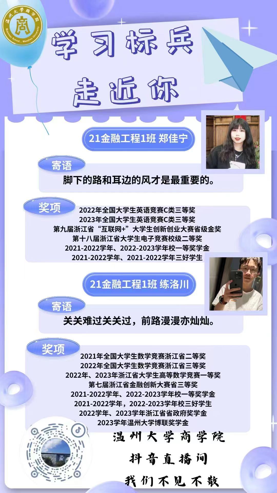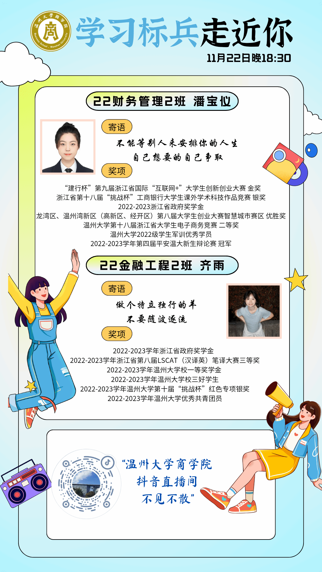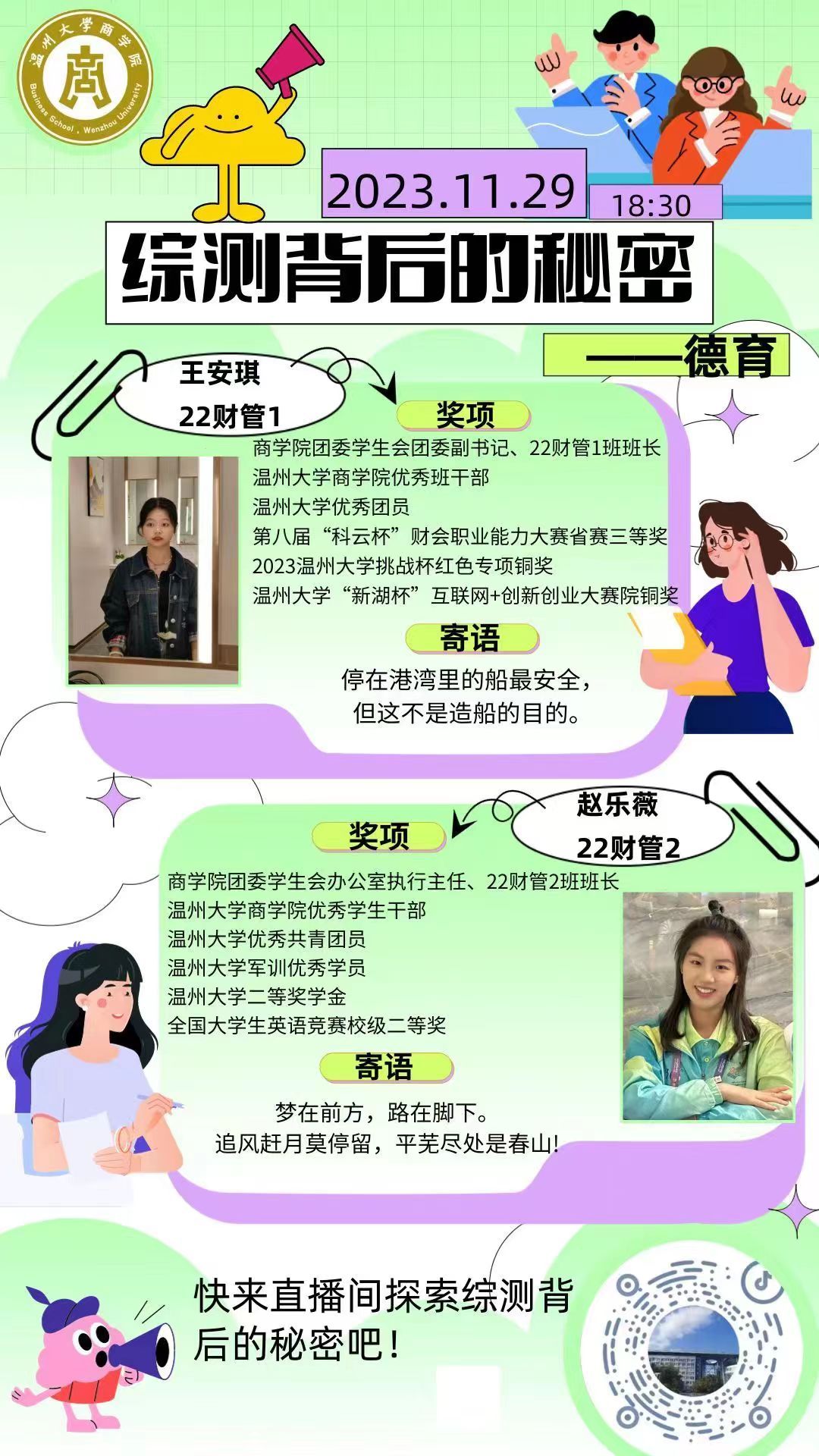 践行“直播+” 红色组织,通过直播宣讲入党入团等内容,全力推进三全育人;践行“直播+”学风建设,举办“学习标兵”“综测背后的秘密”等系列活动,邀请各位优秀学长学姐通过线上直播的方式分享学习经验;践行“直播+”科技创新,开展一系列科创分享直播活动,邀请有丰富科创竞赛经验的竞赛大牛在线交流。践行“直播+”校园文化,在直播期间以承载校园文化的商院独家定制文创周边作为线上互动奖品,凸显学院的文化积淀与特色;践行“直播+”学生权益维护,打造校园反诈直播课堂、金融公益宣讲等活动,并诚邀多所银行一同开展了相关直播。