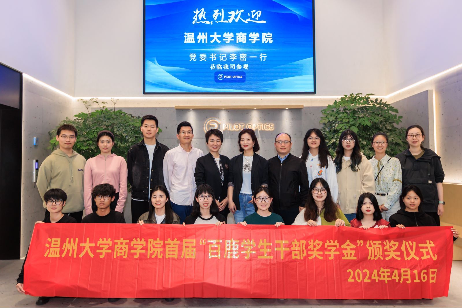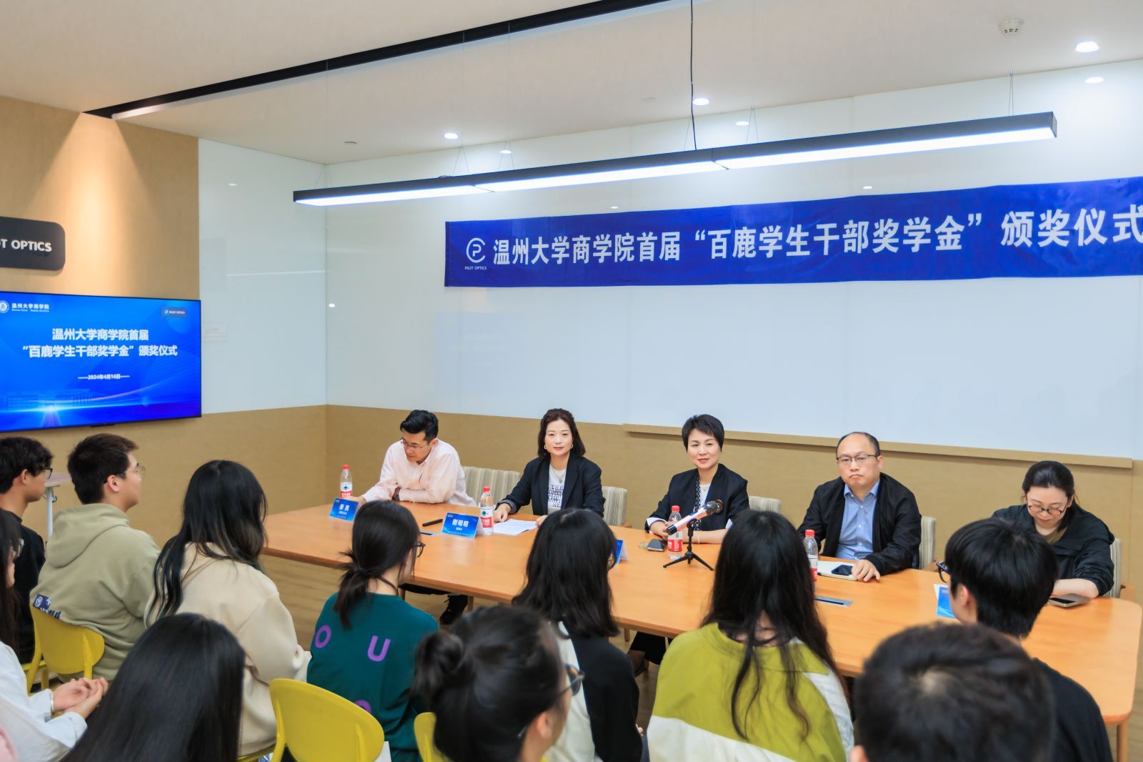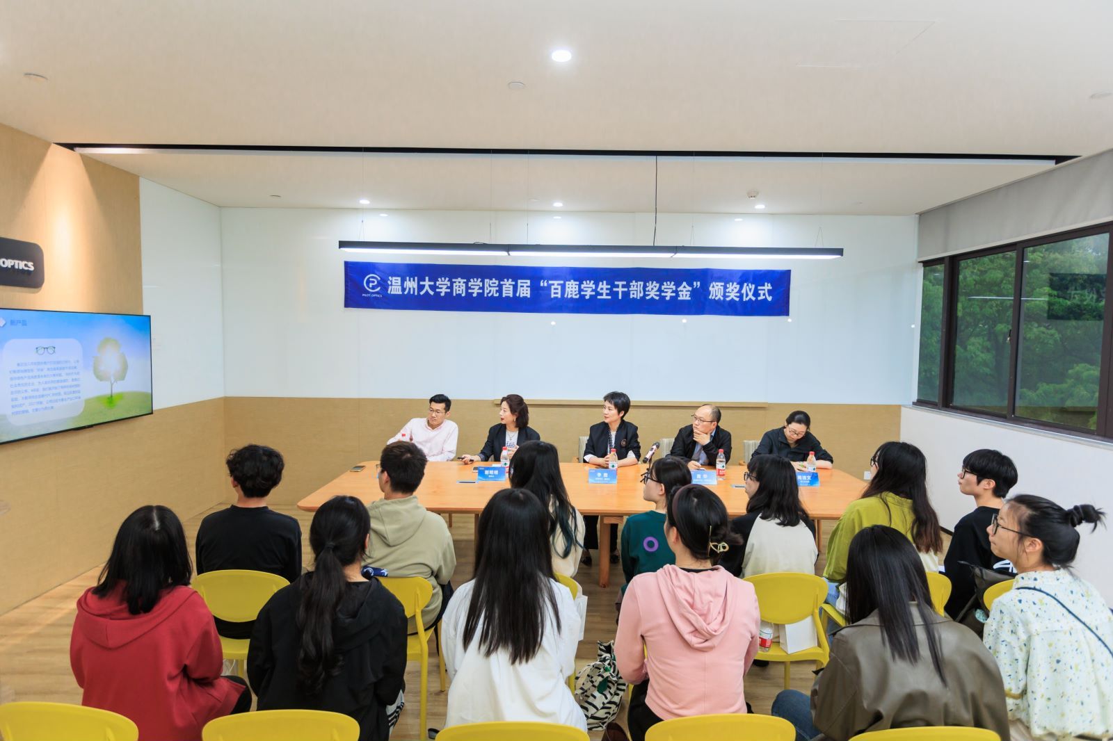 为发挥优秀校友的榜样作用,表彰学生干部在学院学生工作中的杰出贡献,4月16日下午,成人电影 在百鹿国际贸易有限公司举行了首届“百鹿学生干部奖学金”颁奖仪式。成人电影 94外贸校友、温州百鹿国际贸易有限公司董事长谢明明学院党委书记李密,党委副书记唐华,国贸系主任姜亮,学生科科长周洁文,研究生会、学生会、党员服务中心指导老师以及获奖学生干部代表参加了此次活动