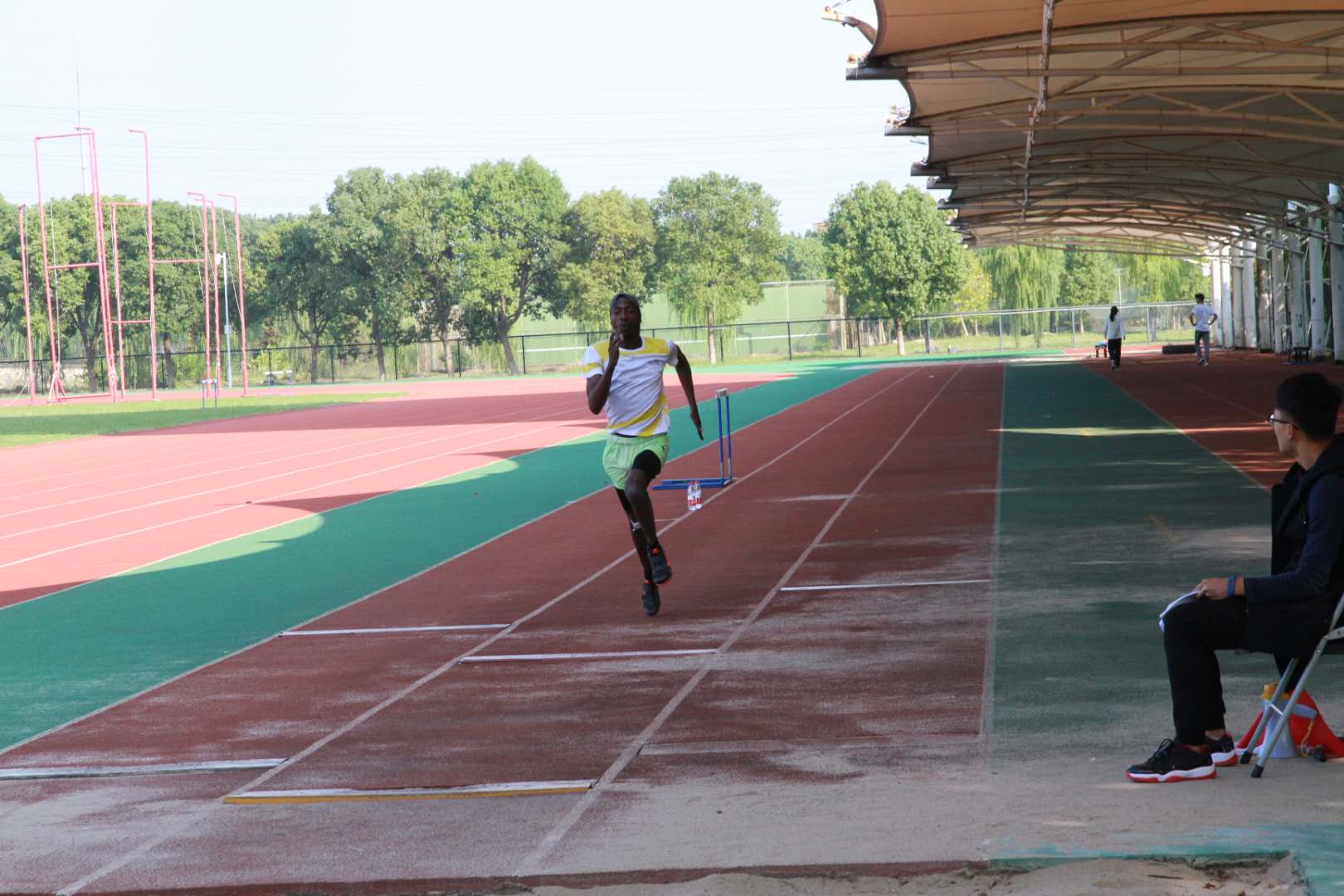 跳远比赛上还出现了外国友人的身影,他们其中一位虽带伤上阵,但最后以大比分领先其他选手,拿到了跳远和三级跳两个项目的冠军。外国友人的参与为本次院运会增添了一笔亮丽的色彩。院运会上当然也少不了志愿者们忙碌的身影,他们给运动员们送水、报幕、拍照……正是有了志愿者们的无私奉献,让院运会更加圆满精彩。
