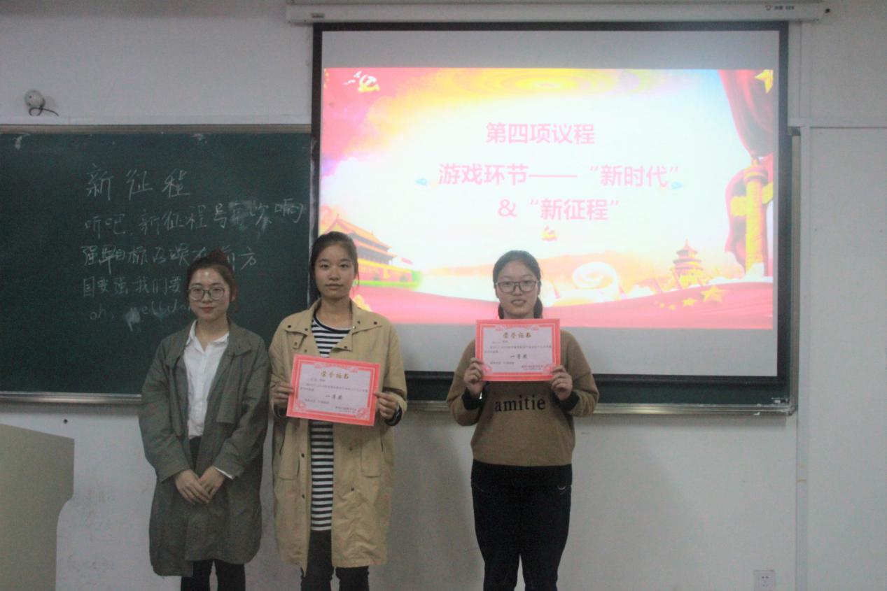 团委副书记陈扬为本次团干培训致辞。她激励我们应在大学生活中奋勇前行,不要荒废时间,要利用一切资源来充实自己,使自己从内而外发生蜕变,进而在人群中脱颖而出,成就一个不一样的自己。刘慧新同学为团学干事们播放了十九大报告的视频,在观看视频的过程中,习近平总书记妙语连珠,赢得了阵阵掌声。观看完十九大报告的视频后,主持人就观看的结果进行随堂测试。在紧张的脑力劳动后,进行的是游戏环节。通过击鼓传花选出8名成员,4人一组为一队分别创作了与十九大有关的两首诗,文笔稍微逊色的小组进行了才艺表演,让大家大饱眼福,赢得台下阵阵掌声。最后进行的是颁奖典礼。团委副书记陈扬,组织部部长裴薛勤,学风部部长彭之茂分别为在答题环节中的优胜人员颁发了奖状。