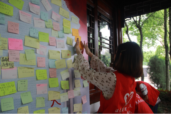 下车后,志愿者们步行到了翠微山脚下,大家沿坡而上,到达了勒事陵园,高耸的人民英雄纪念碑,让志愿者们肃然起敬,碑后是一面写满烈士名字的黑墙,志愿者们在纪念低头默哀三分钟,脑海中掠过千丝万缕,而后,志愿者们在便利贴上写下感激烈士的话语,贴在身后的留言墙上,表达一份微小的感谢,小小的便利贴,承载着大家对烈士的无限敬意和感激。看着满墙的名字,满墙的便利贴,不禁感叹,今日的美好和平的生活,是先辈们奋斗出来的。