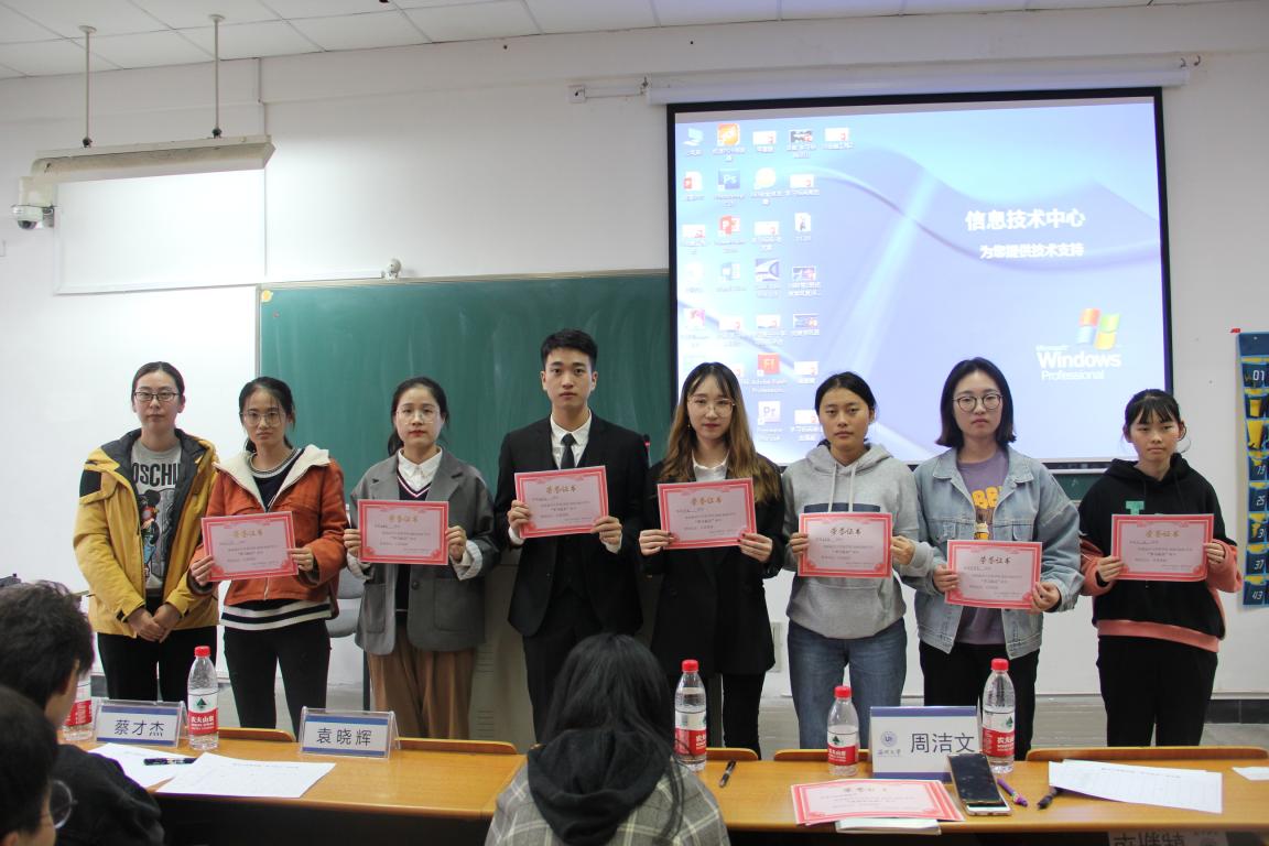 评比活动的第二环节是优良学风班的评比。每个班级的代表依次上台展现自己班级的学习成绩情况、活动组织实施情况等,体现出温大商院各个班级的优良学风。