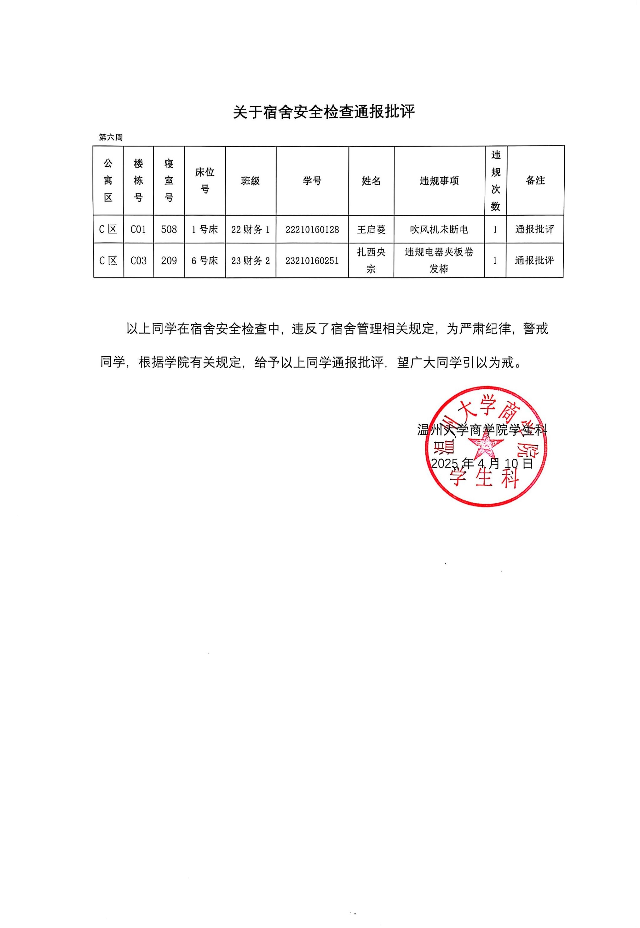 关于2024/2025学年第二学期第六周学生公寓安全检查通报批评的通知
