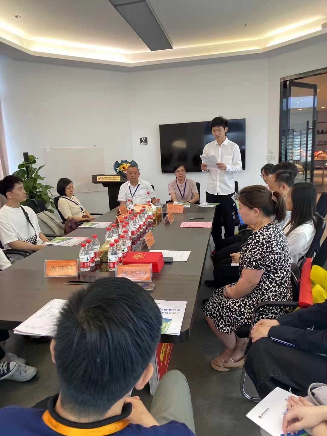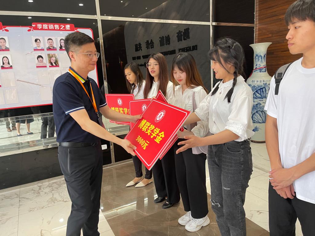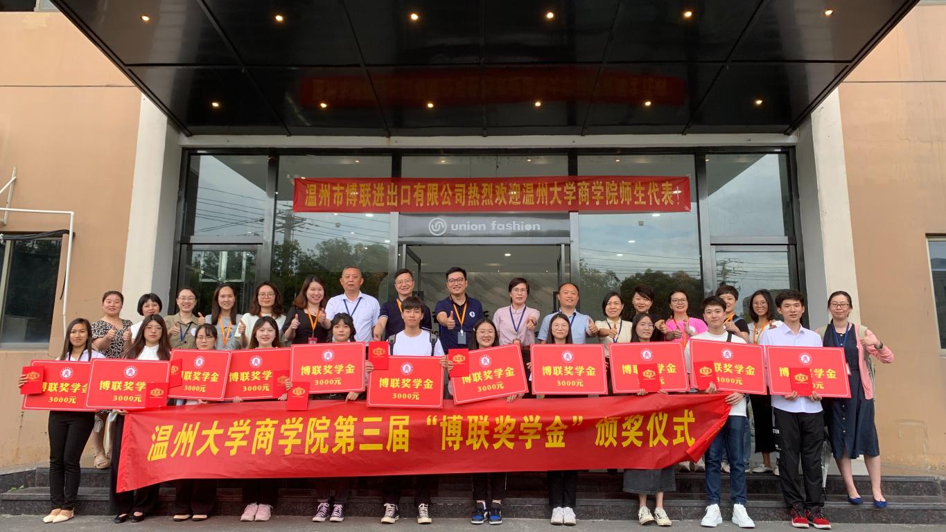院长胡振华、党委书记郑彩莲、党委副书记唐华、国际经济与贸易专业负责人林俐教授、学工办副主任周洁文、辅导员马金凤及获奖学生一行到温州市博联进出口有限公司举行第三届“博联奖学金”颁奖仪式,此次选址在校友公司,一方面是为感谢90级钱旦初校友、94级徐开晴校友捐款设立的“博联奖学金”,另一方面也带领学生参观企业,让他们切实感受成人电影,做到理论与实践相结合。仪式由唐华副书记主持。